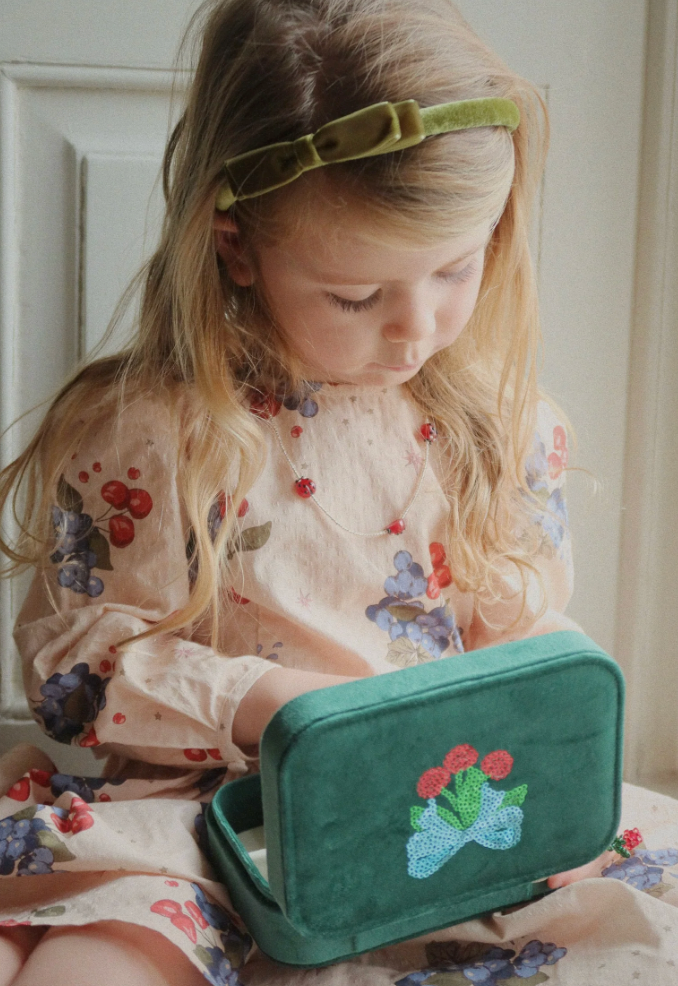 A jewelry box made of soft velour, filled with all the bling a child could wish for!