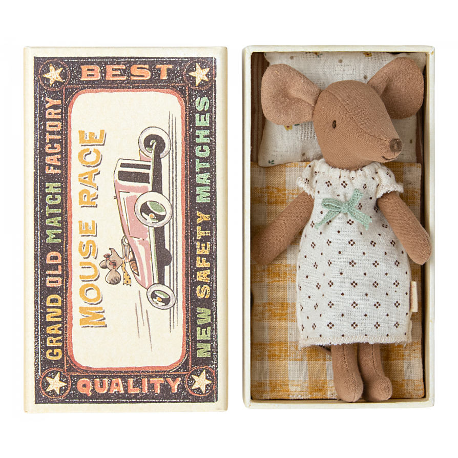 A classic Maileg item. This mouse is ready for hours of play and sleeps soundly in the matchbox. The clothes and bedding come with unique Maileg prints and beautiful colors.