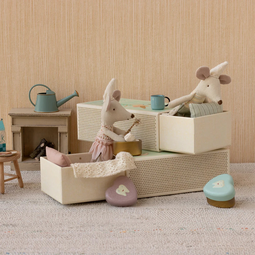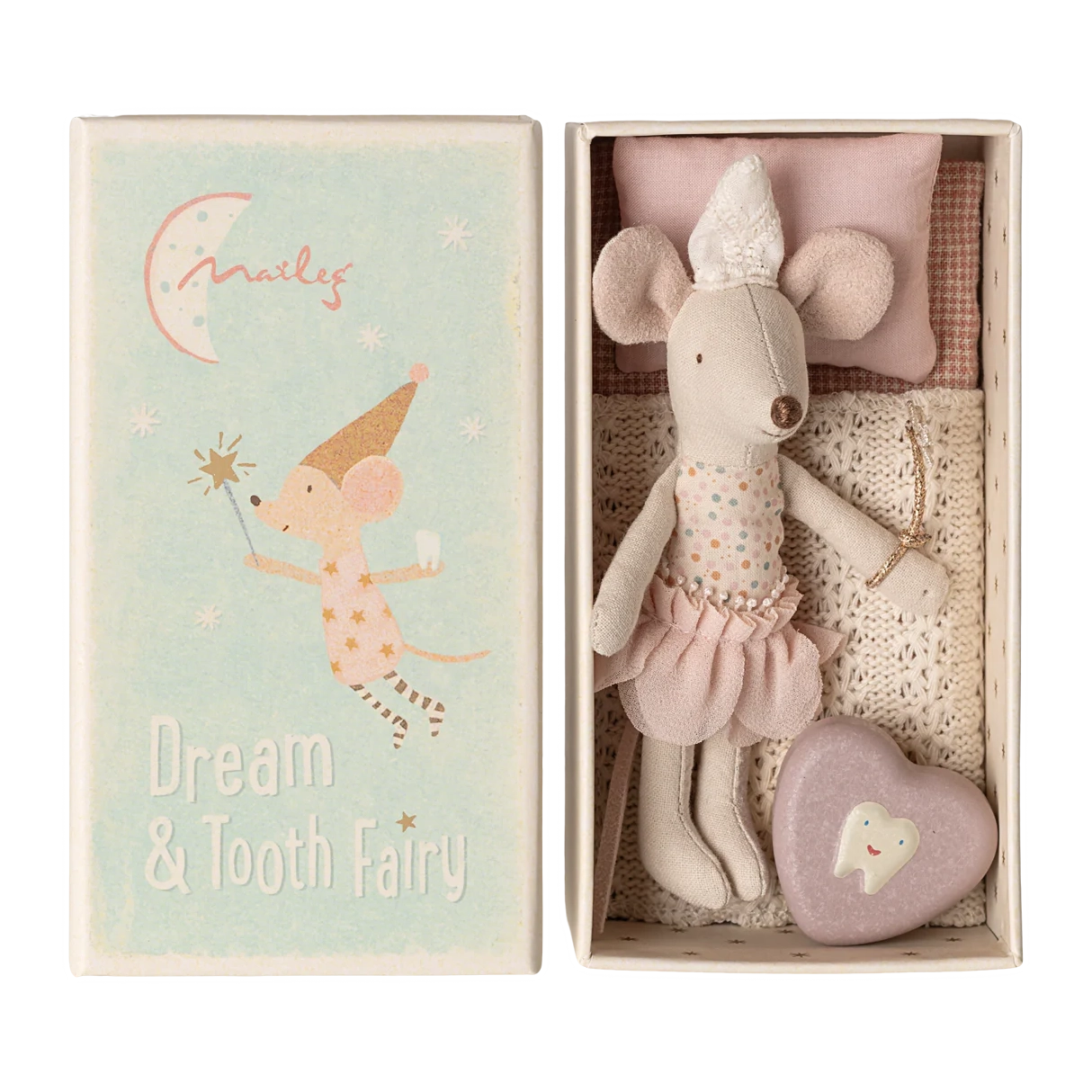 At night, the Tooth Fairy spreads fairy dust, collects teeth, brings treats, and ensures you have sweet dreams. She's magically dressed and sleeps in soft bedding—including a tooth box and matchbox. Fabrics may vary.