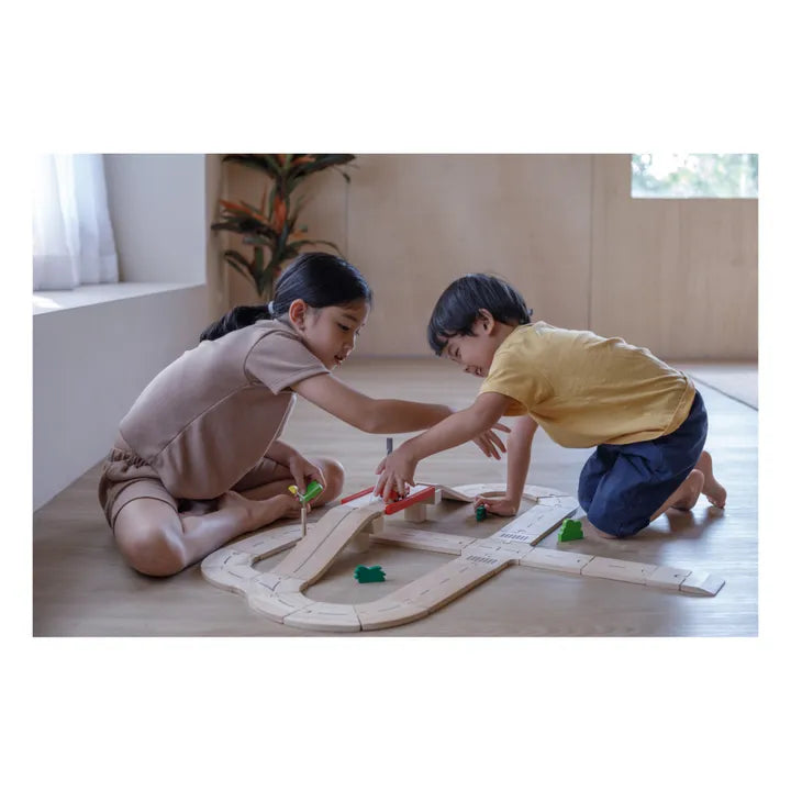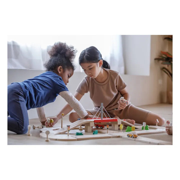 The PlanToys tram with wooden accessories invites children to create imaginative city and traffic scenes. With numerous road pieces and lovingly designed accessories, new play worlds can be created again and again, fostering creativity, logical thinking, and role-playing. Ideal for building, combining, and storytelling.