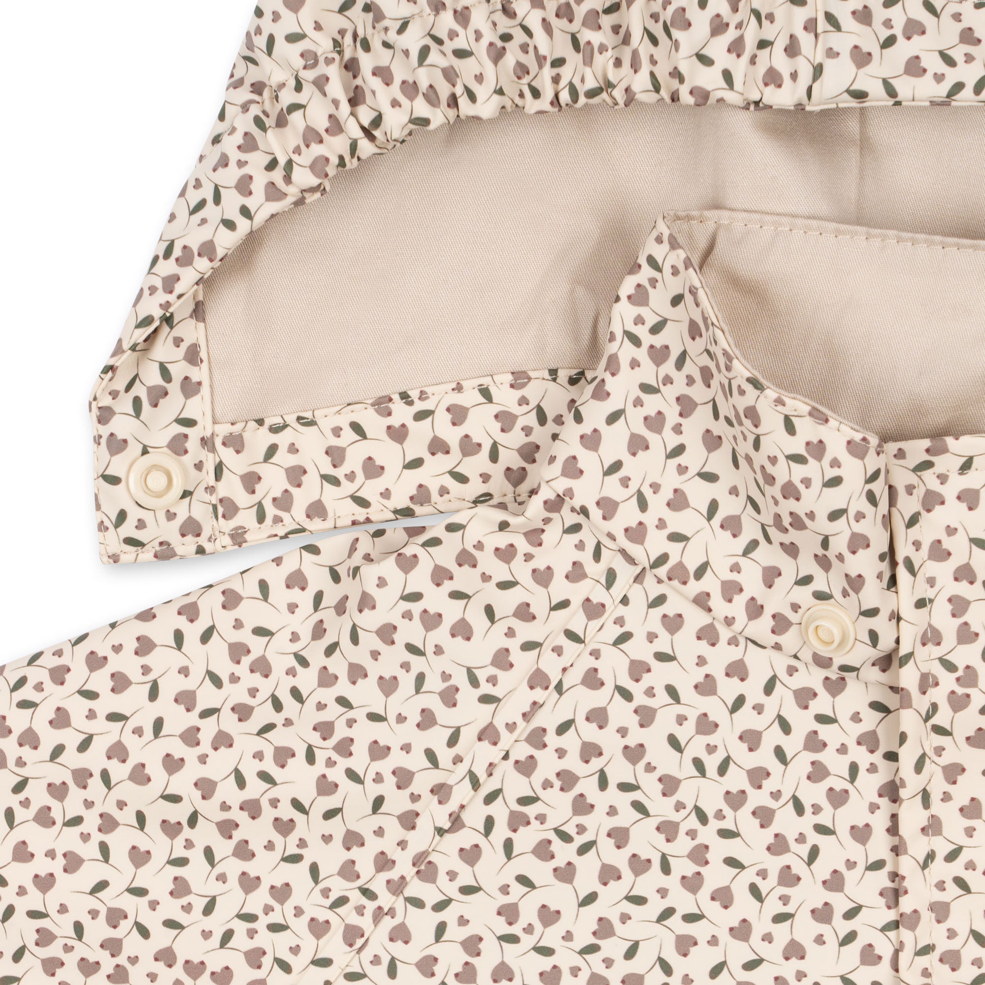 Windproof and waterproof PU rain set with a soft fleece lining and a detachable hood that fastens with buttons. Elasticated cuffs at the hands and feet ensure the set stays in place. The jacket closes with a zipper and buttons and features practical inner loops and side pockets. Sizes 9 months-4 years have suspenders, and sizes 5-6 years and up have an adjustable waistband.