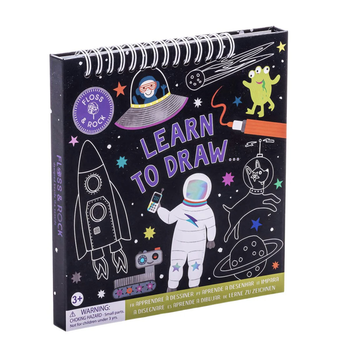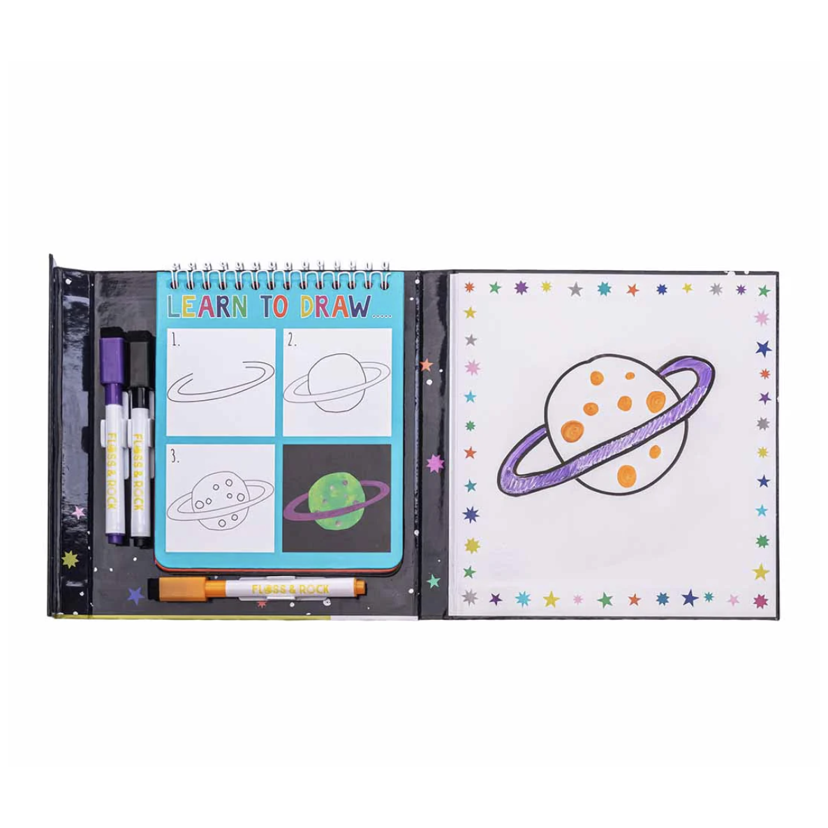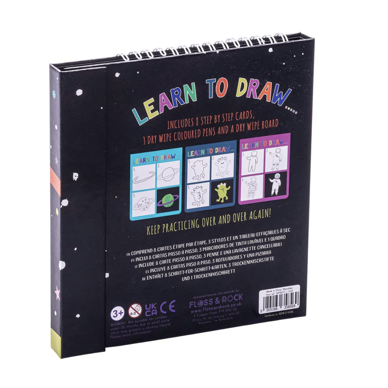 With the Learn To Draw Space set, children will learn to draw their own space artwork in a fun way! The book contains 8 sturdy, wipe-clean pages with step-by-step instructions for drawing rockets, planets, or astronauts in just three easy steps. Thanks to the three colored pens with erasers, the pictures can be redrawn again and again—perfect for little artists and big imaginative adventures.