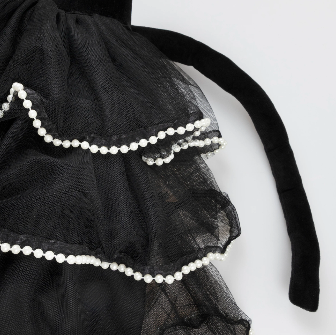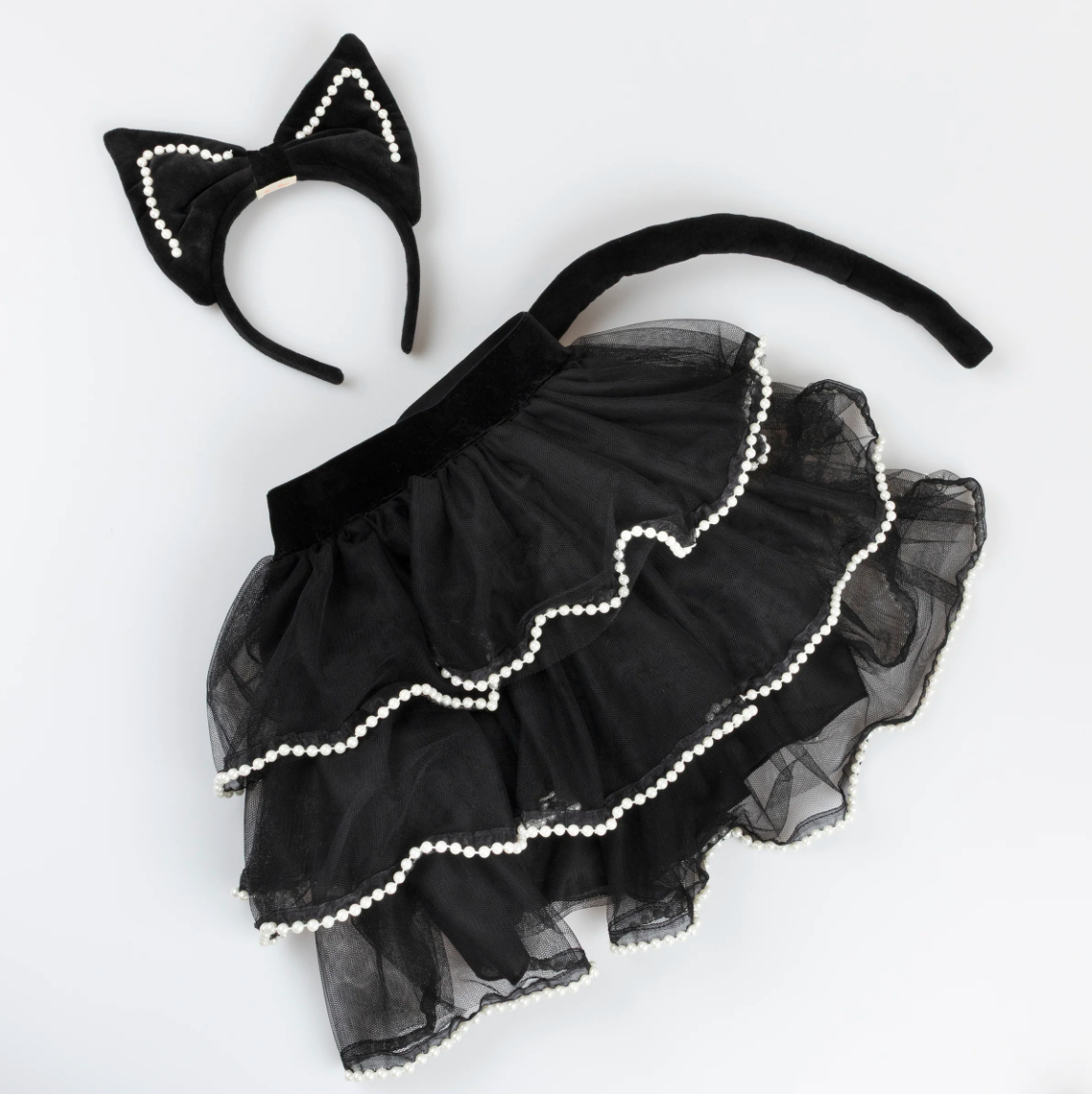 Meow! With this chic cat costume, children transform into elegant little felines. The black tulle skirt with pearl embellishment and detachable tail makes the outfit extra versatile—perfect for Halloween, dress-up parties, or imaginative play at home. The velvet headband with a statement bow and pearl trim completes the look and can also be worn independently as a fashionable accessory.
