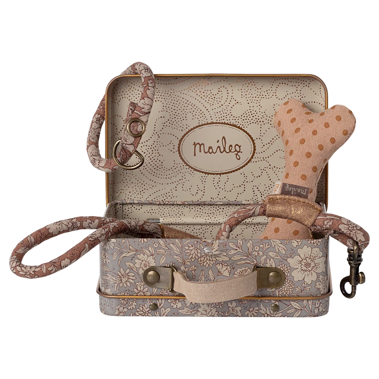 This set is everything you need for your soft plush dog. The set includes a bone, a collar and a leash, beautifully packaged in a metal case with a beautiful Maileg print.