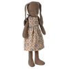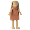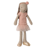 The famous Maileg rabbit is dressed as a ballet dancer. He's wearing a pink suit, a tulle skirt, and ballet shoes.