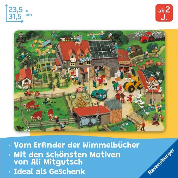 In My Big Search-and-Find Book , colorful, detailed illustrations await little explorers: from farms and construction sites to mountains and beaches, and from zoos and flea markets to city parks in spring and winter. Ali Mitgutsch tells stories without words – instead, he uses countless little scenes that children can rediscover, expand upon, and name again and again. A true picture book classic that playfully fosters imagination, vocabulary, and a love of storytelling.