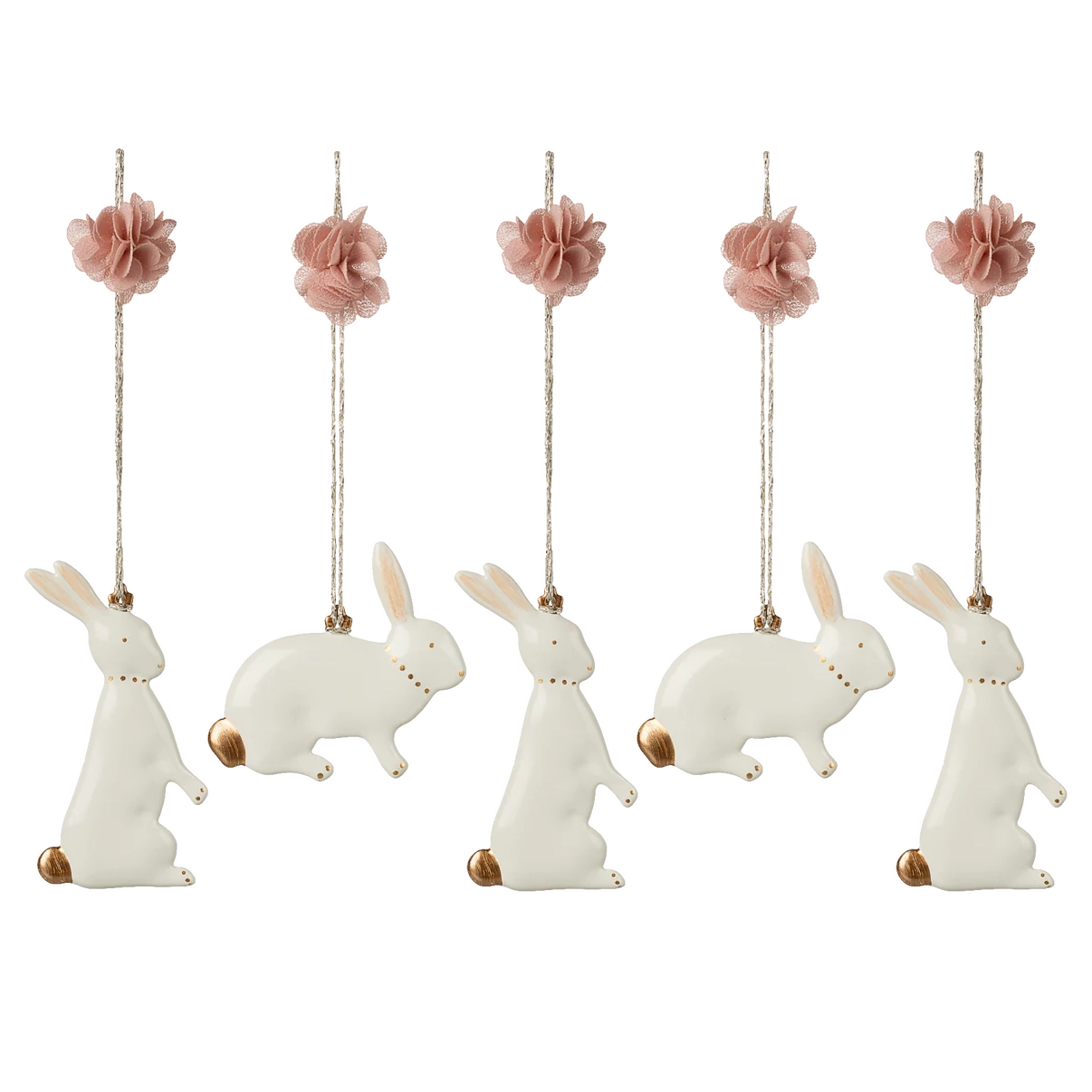 Osterhasen-Ornamente aus Metall mit handgemalten Details und einem weichen Pompon am goldenen Band. Hänge sie als Dekoration an einen Ast oder lege sie auf den Ostertisch. Jede Schachtel enthält 5 Ornamente.