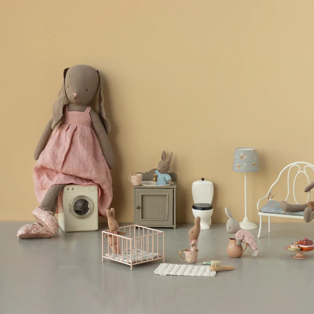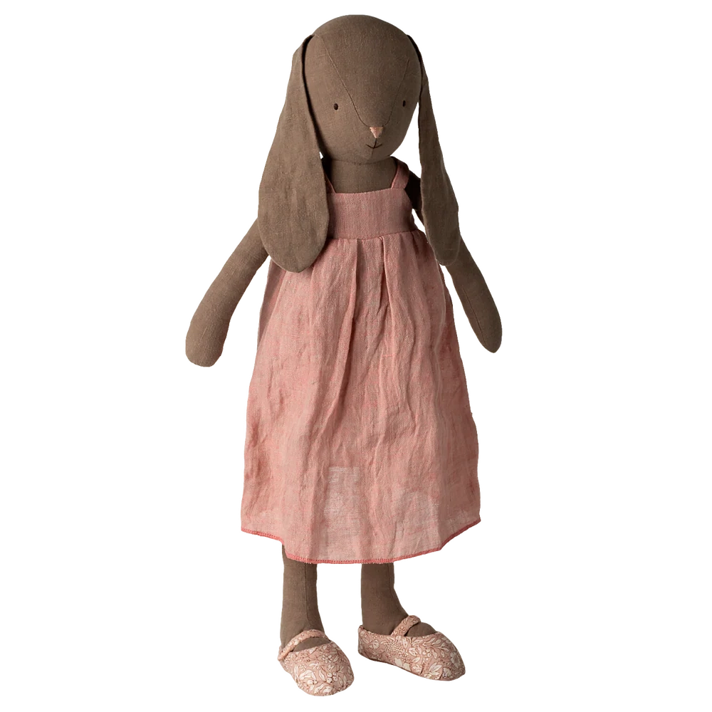 A classic bunny made from soft, natural materials. She's dressed in a pretty dress and wearing soft shoes. Check out our clothing collection to expand your bunny's wardrobe.