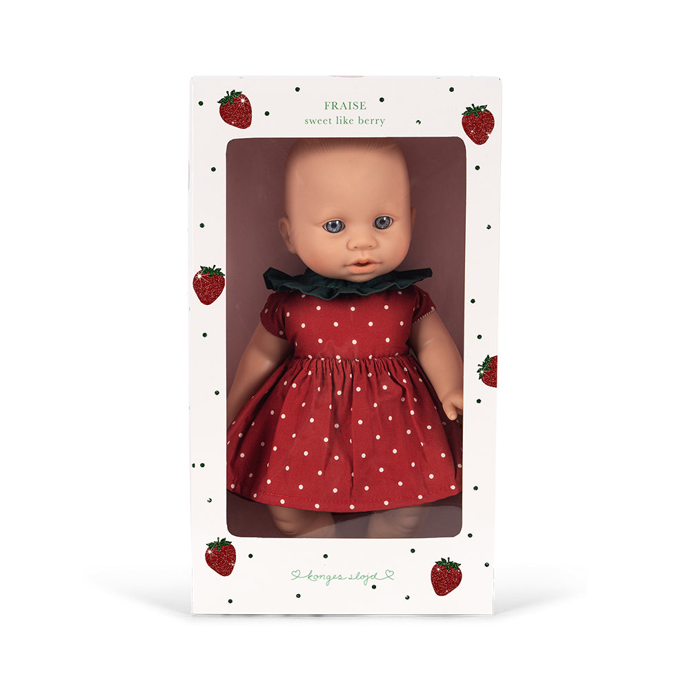 The Fraise Baby Doll is a sweet baby doll for children aged 24 months and up – lovingly designed and perfect for little hands. With its strawberry-patterned dress, deep blue, lifelike eyes, and soft, flexible body, it invites cuddling, dressing up, and imaginative role-playing. Measuring 32 cm, it's a wonderful companion for everyday life in the nursery.