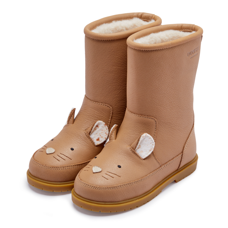 Warm, playful, and exclusive: The Wadudu Exclusive "Mouse" boots by Donsje are the perfect winter companion for little adventurers. With their charming mouse design, complete with ears and whiskers, they're not only eye-catching, but also exceptionally warm thanks to the soft lining made of genuine virgin wool. The sturdy rubber sole ensures secure grip with every step—indoors and outdoors.