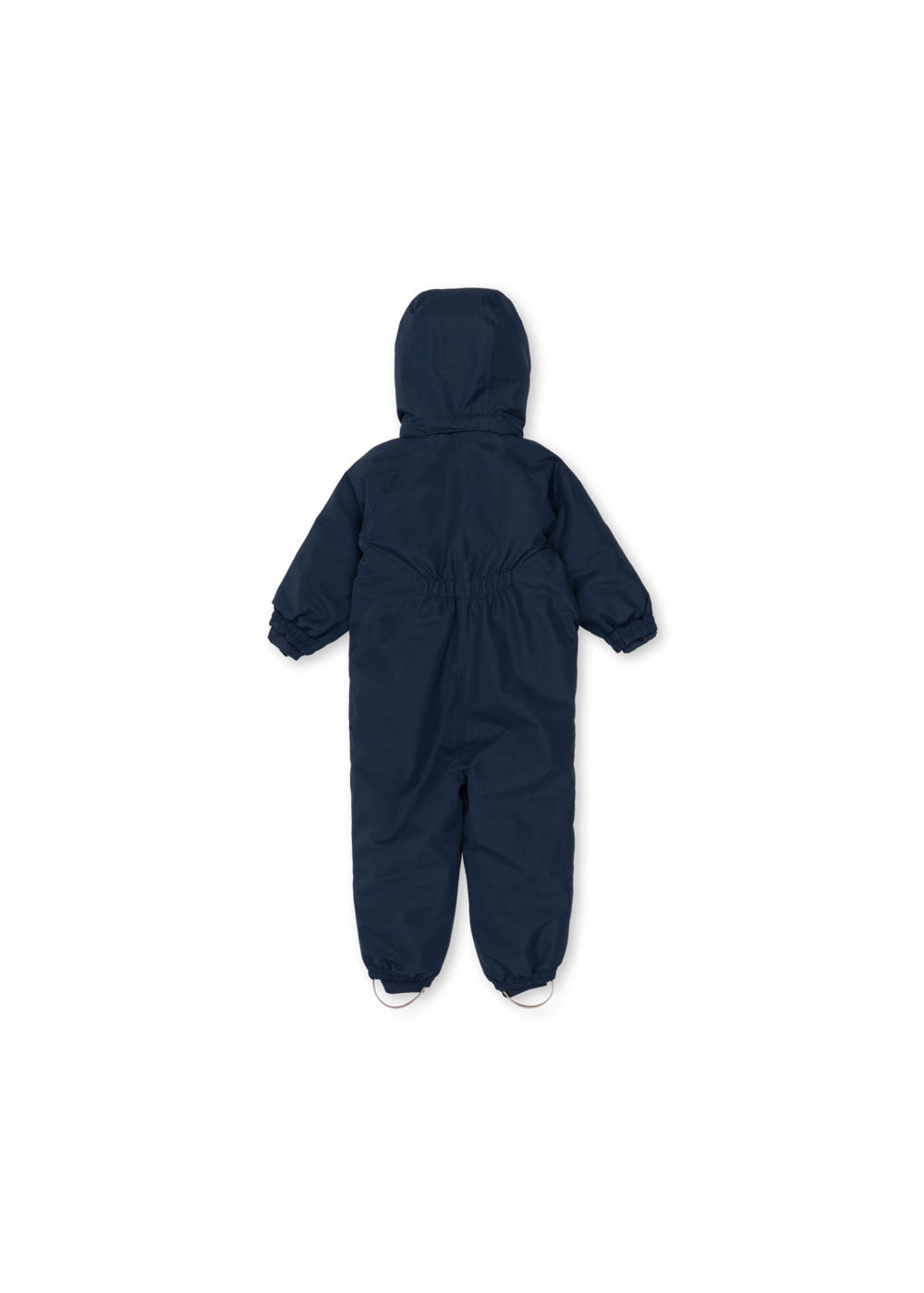 A highly breathable, waterproof and windproof snowsuit made from 100 percent polyester. The hood is removable and can be fastened with buttons. Elastic cuffs and rubber foot loops ensure that the snowsuit stays firmly in place on the hands and feet. There are suspenders on the inside that make it easier for the child to take off the upper part of the snowsuit if they get too warm or go inside
