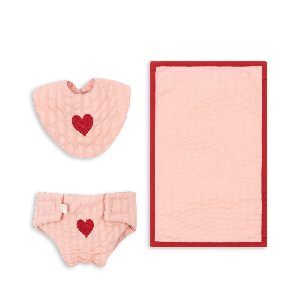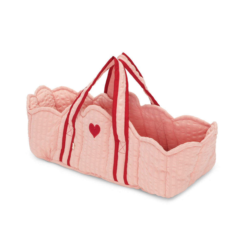 This padded doll carrycot made of 100% organic cotton is the perfect companion for little doll parents. With its practical carrying straps, elegant piping and decorative wave edge, it offers not only comfort but also style. The carrycot is softly lined and ideal for children aged 3 and over.
