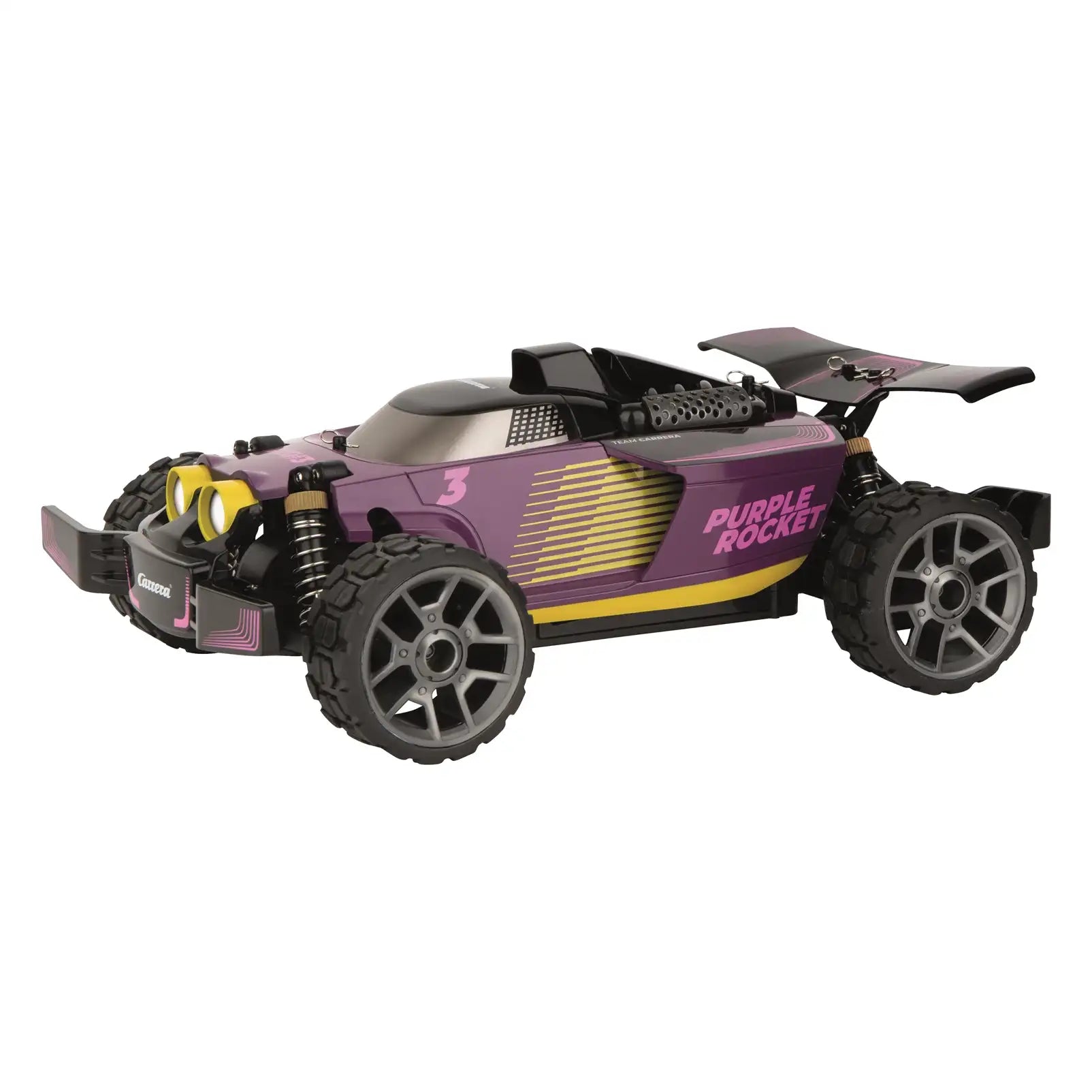 Ready for action? You can get started right away with the elegant purple buggy from the CARRERA RC professional series! In 1:18 scale, you can whizz down the track at up to 50 km/h - no matter whether it's on the road, gravel or mud. Thanks to the precise pistol remote control, you have everything perfectly under control. Just unpack and drive off!