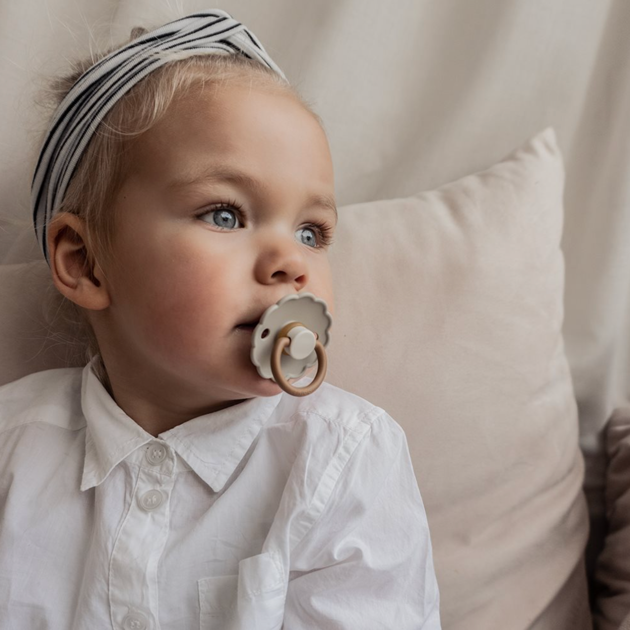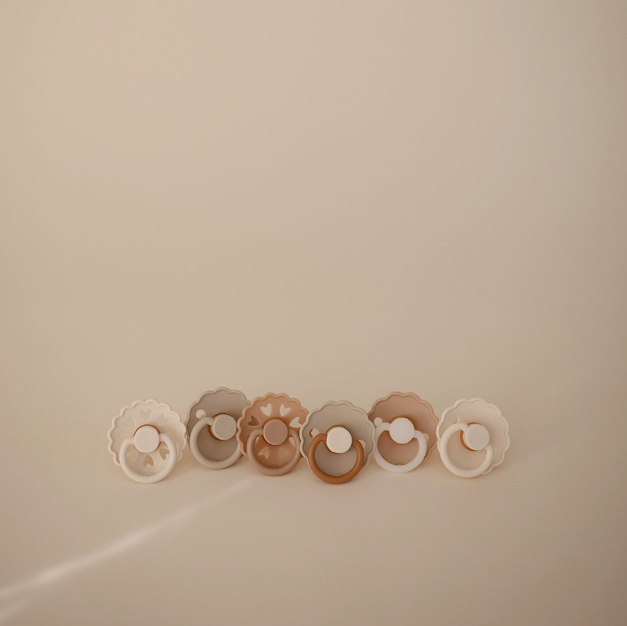 The FRIGG "Cinnamon Charm" pacifier set combines six round pacifiers in warm, natural tones that blend harmoniously into any everyday environment. One of these is a special Night Pacifier with a glow-in-the-dark function: The handle and knob gently glow in the dark, making the pacifier easy to find even at night – without any bright light. All FRIGG pacifiers are designed and manufactured in Denmark and subject to rigorous safety tests.