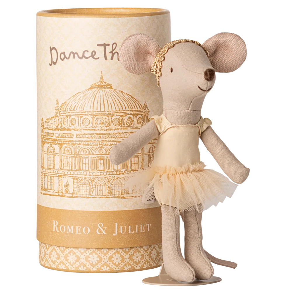 A real ballet dancer. The mouse comes in a beautiful tube with a stand inside, which you can use if you want to display the dancer at home.