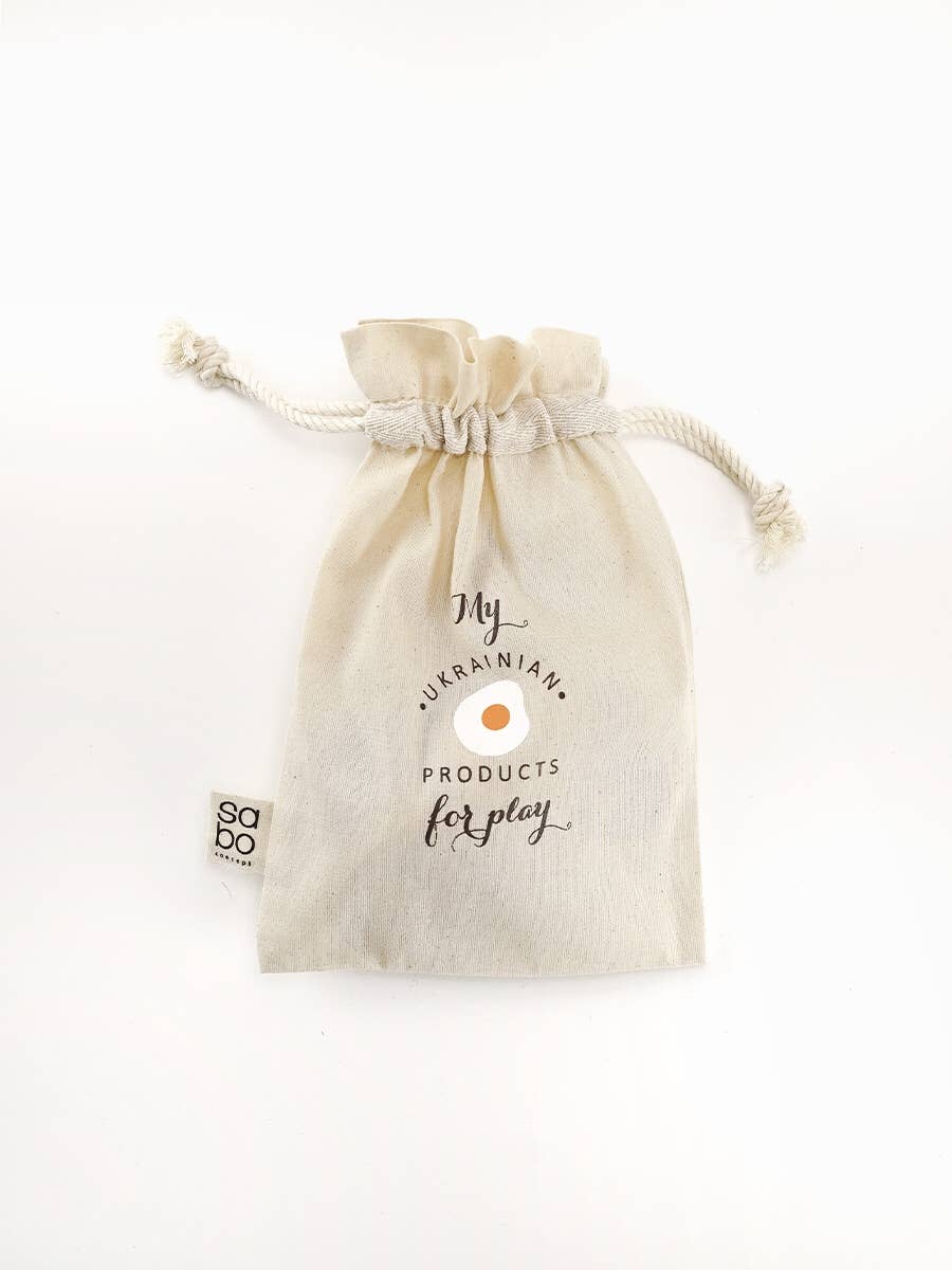 The set includes milk, eggs, butter, cheese, and bread – all with a natural look and painted with child-safe, water-based paint. The products encourage language development, creativity, and social interaction, while the linen bag helps keep things organized.