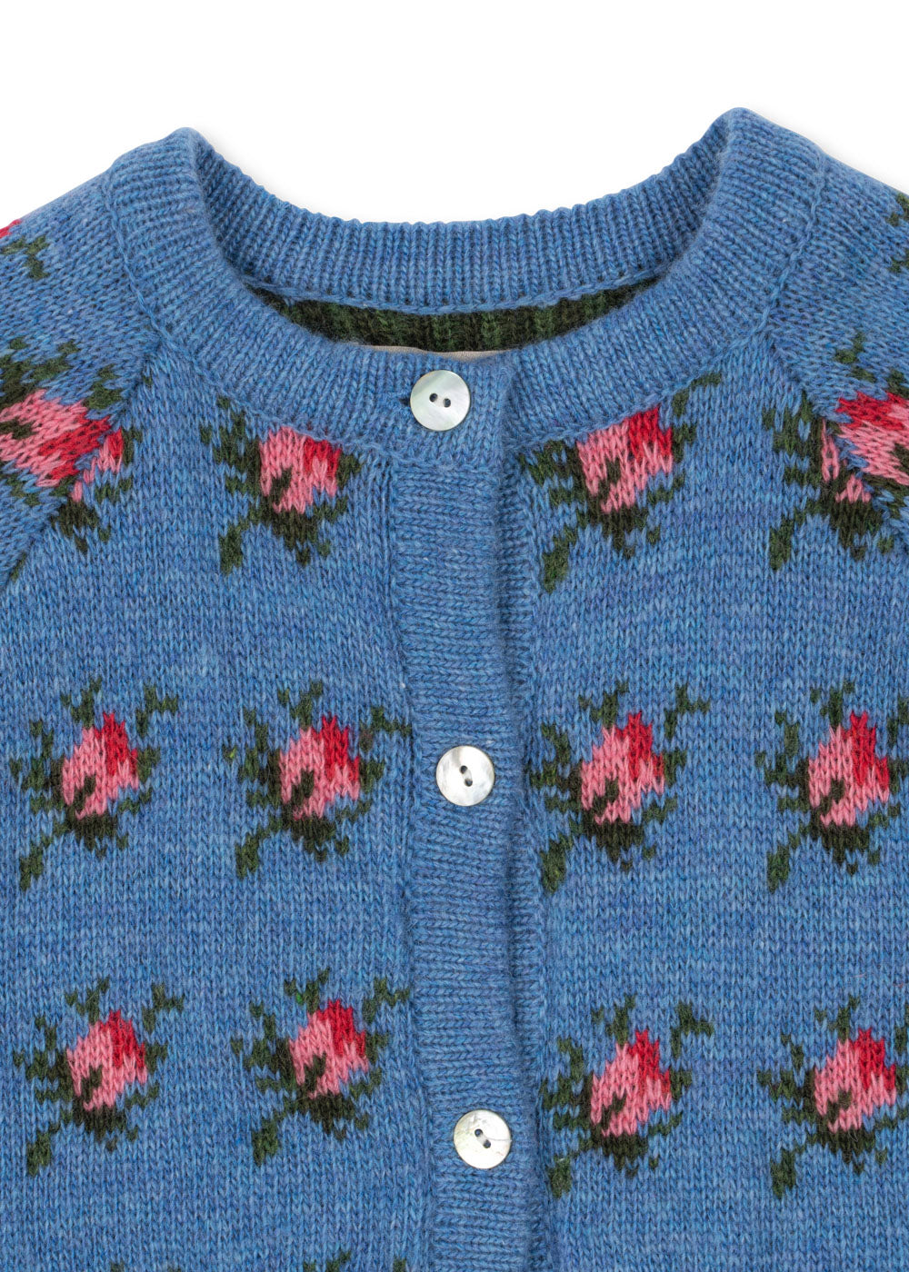 - Design: Round neck, fine ribbed waistband and mother-of-pearl buttons