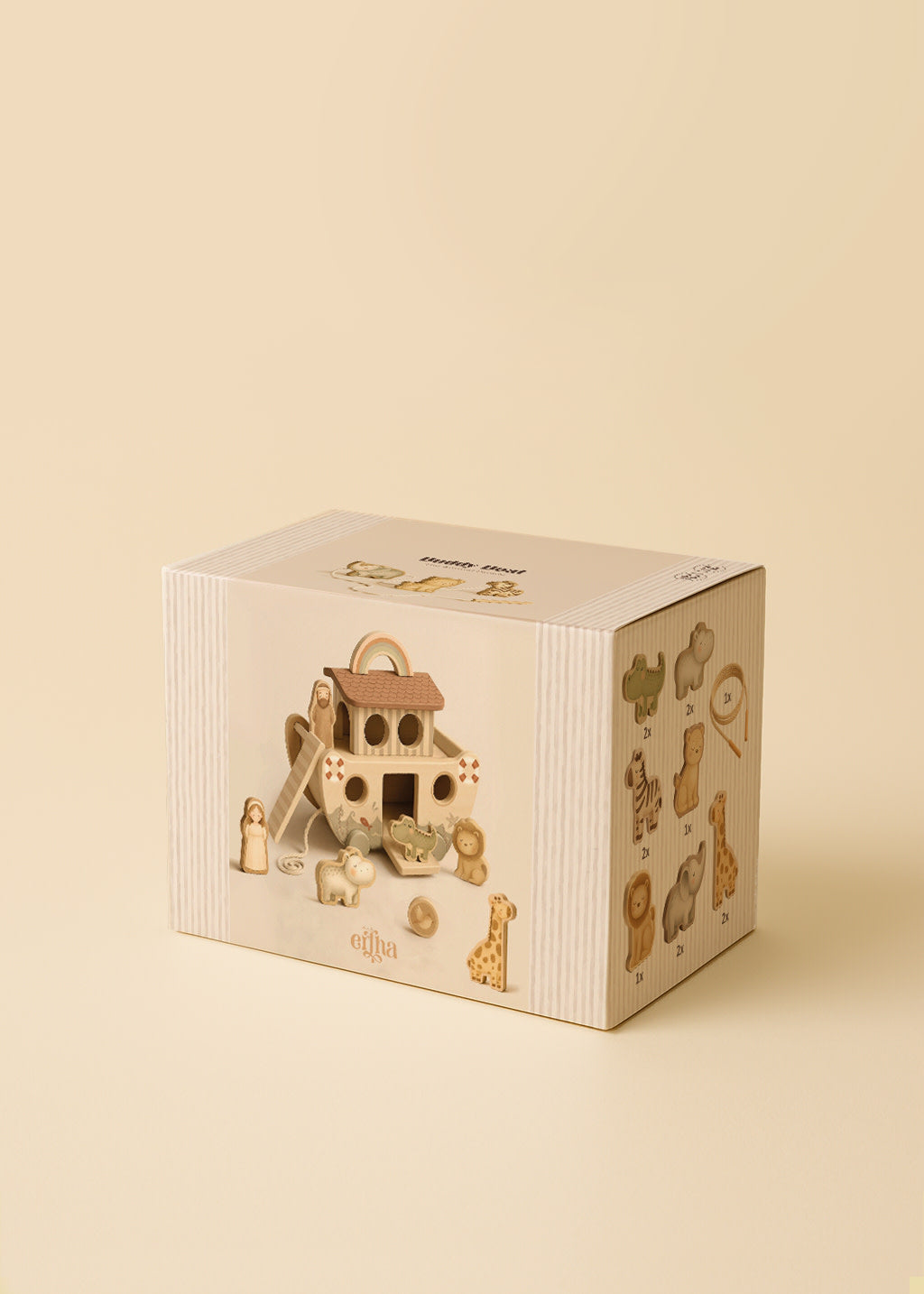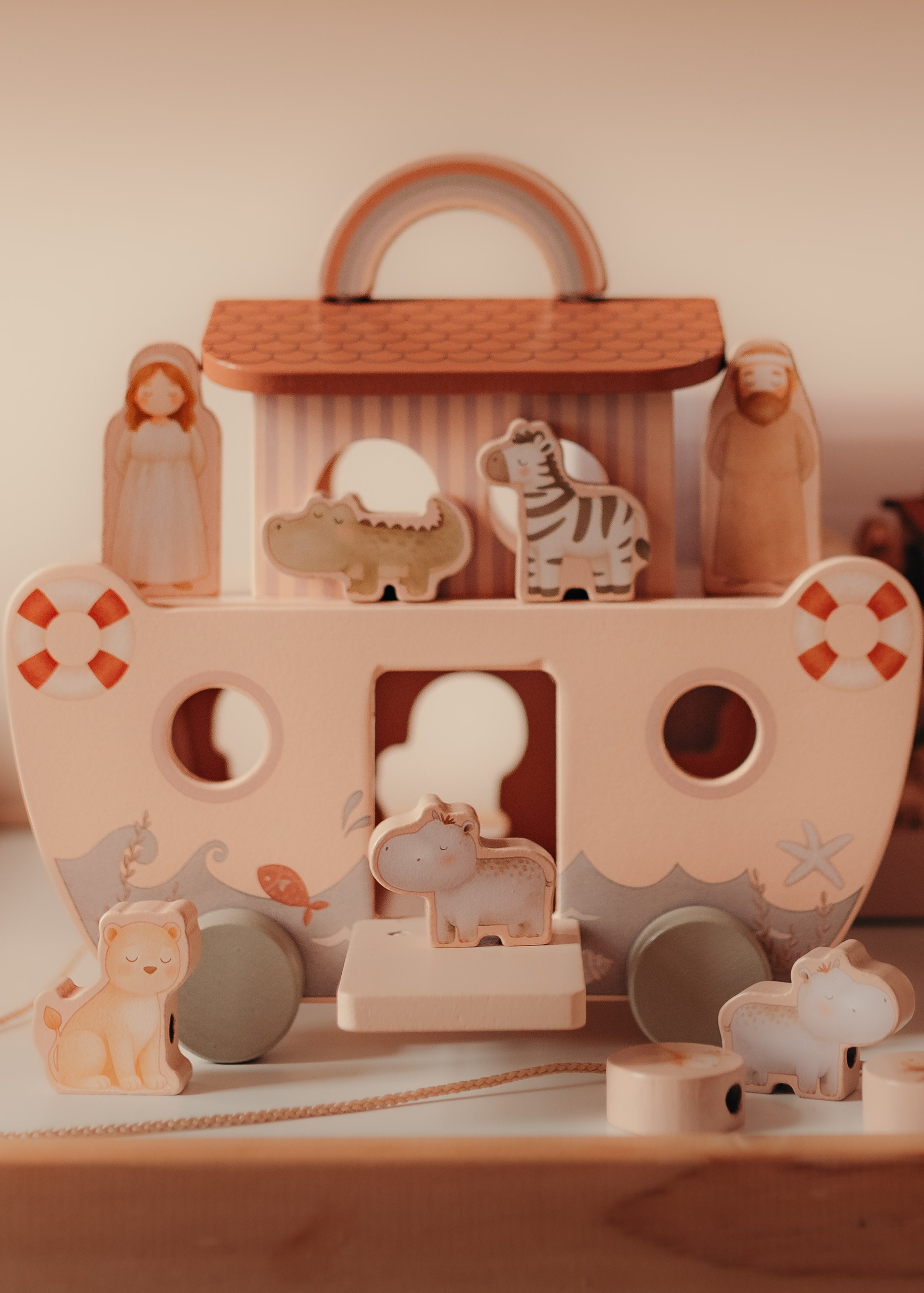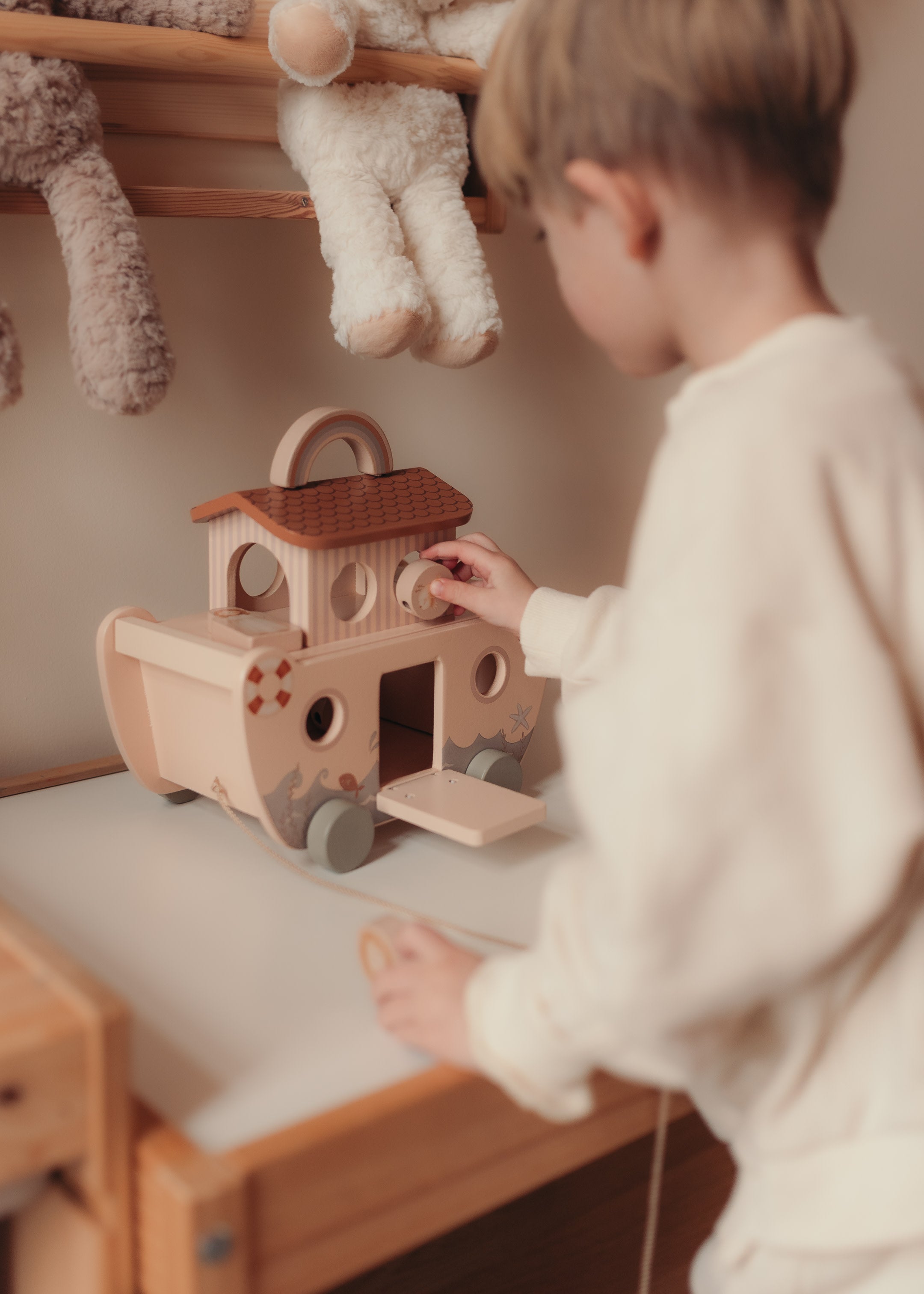 Alle an Bord! Das Buddy Boat ist ein liebevoll gestaltetes Spielset, das Fantasie und Lernen perfekt verbindet. Mit 22 Teilen – darunter ein Boot mit Rädern, 14 Tiere, Regenbogen, Rampen-Treppe und eine Schnur zum Auffädeln – entstehen unzählige Spielideen: Tiere einladen, Abenteuer starten, sortieren, stapeln und fädeln. Besonders das Auffädeln mit der Schnur fördert spielerisch Feinmotorik, Hand-Auge-Koordination und Konzentration.
