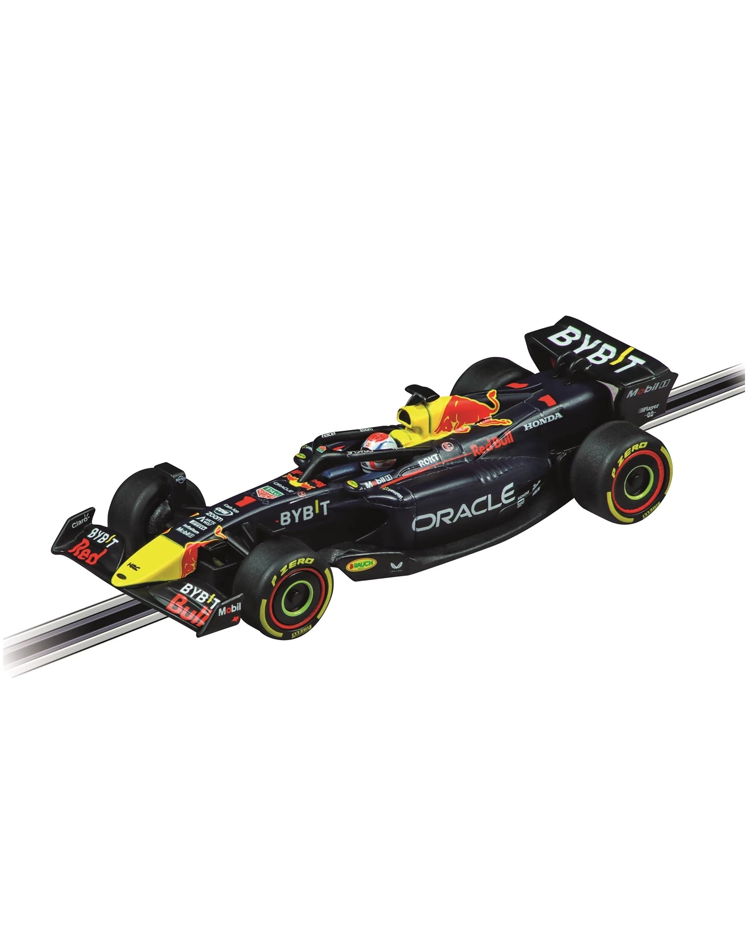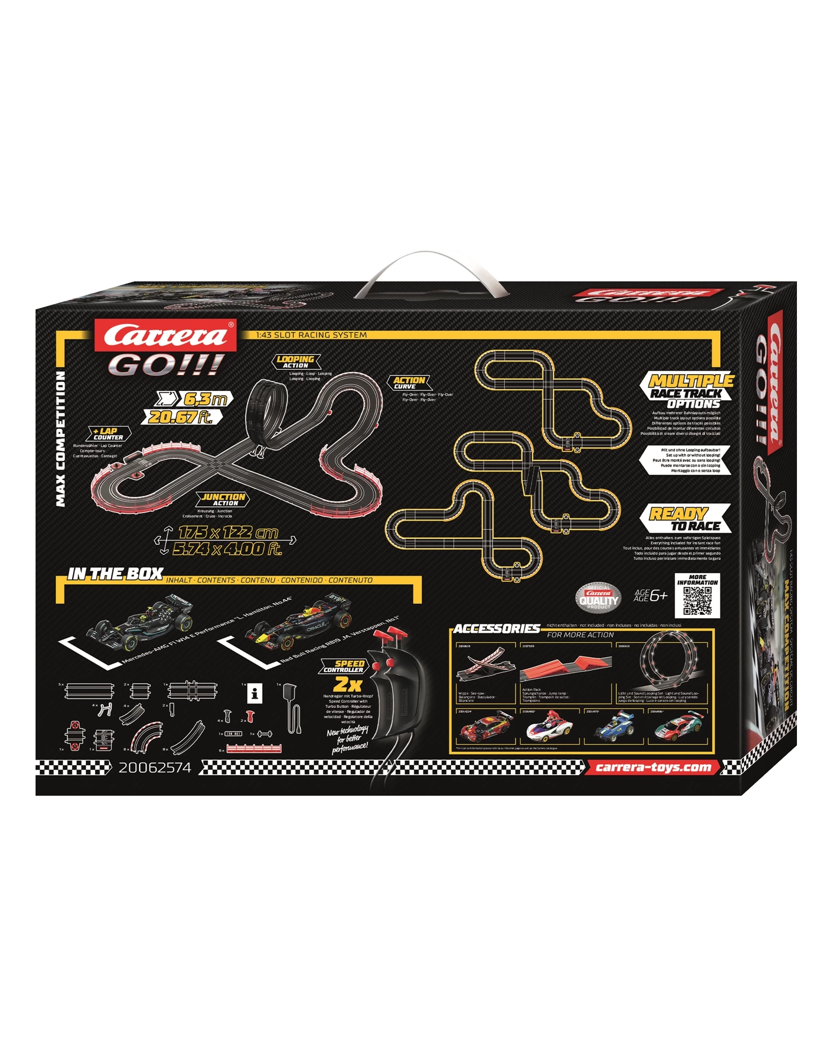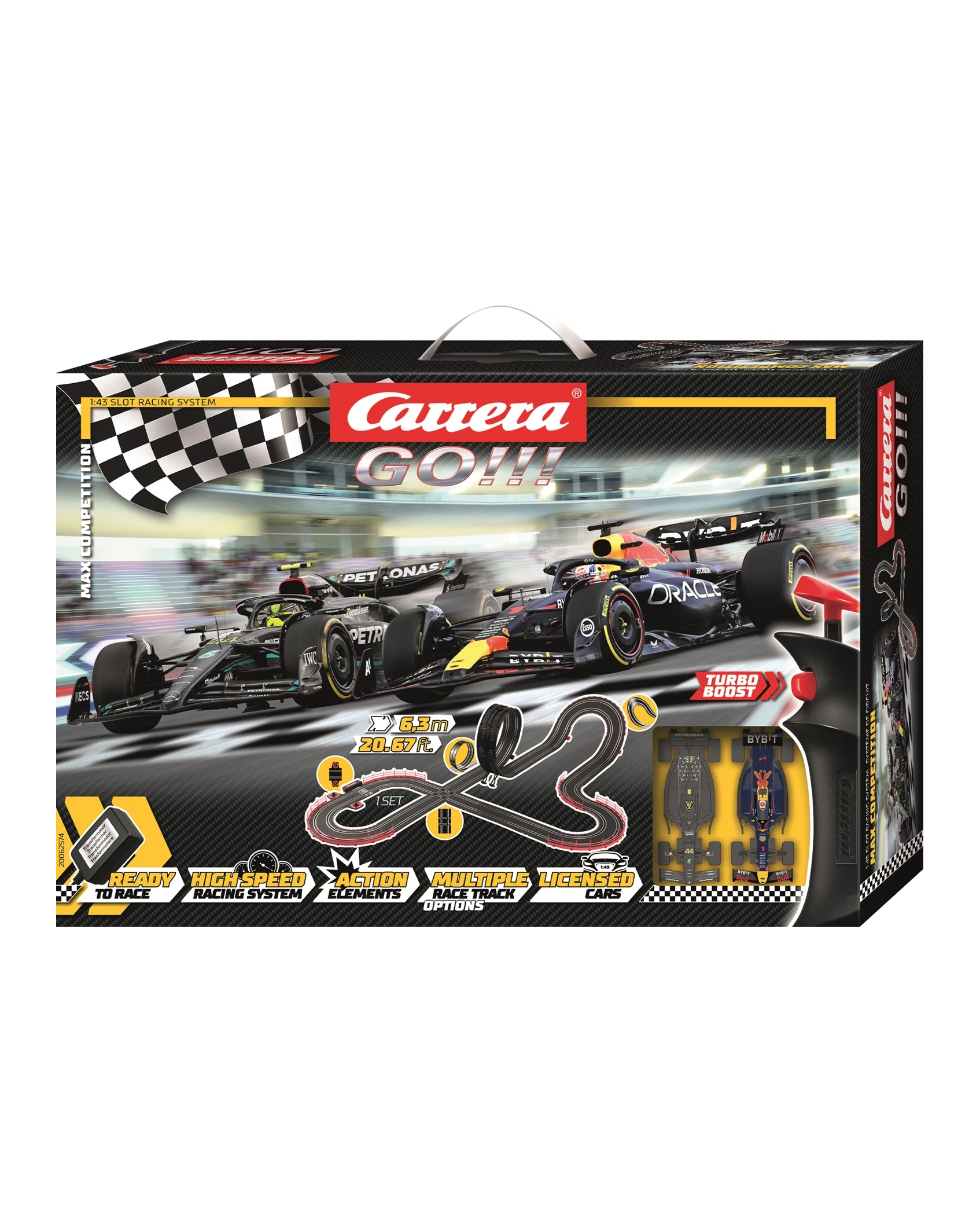 With the Carrera GO! F1 Max Competition, you can bring the authentic Formula 1 feeling home. On the 6.3-meter-long track, multiple world champions Lewis Hamilton in the Mercedes AMG W14 and Max Verstappen in the Red Bull Racing RB19 compete. Loops, intersections, and tight corners demand full concentration, while the turbo boost on the hand controllers provides extra speed – pure racing action in 1:43 scale.