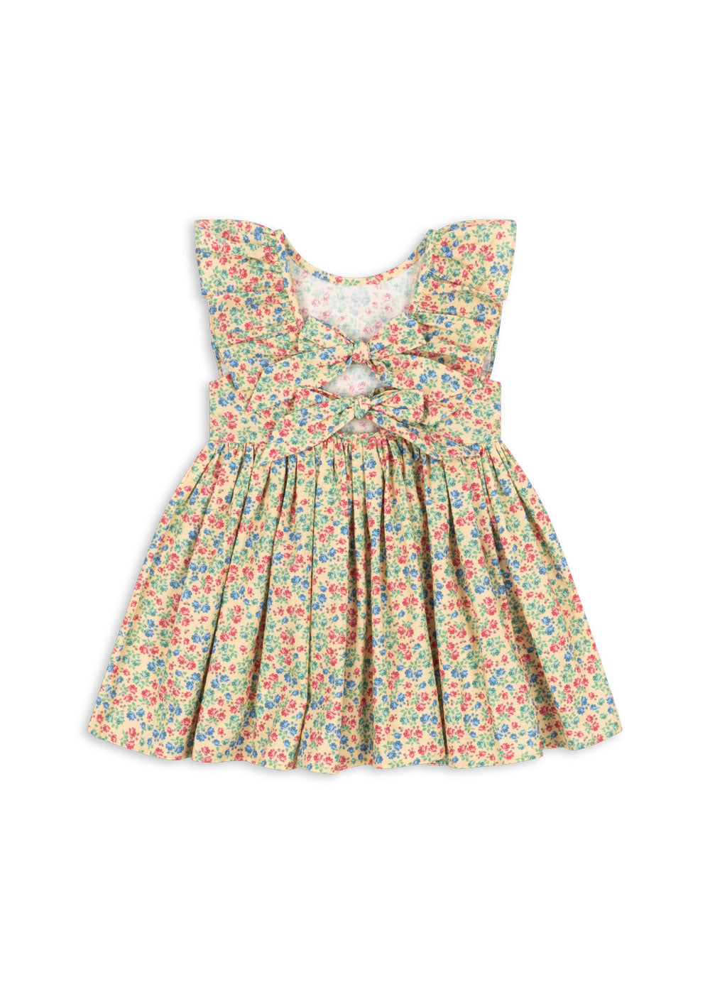 The Cianna dress in Fandango Fleur enchants with its romantic floral design, delicate ruffle sleeves, and lovely bow details at the back. Crafted from soft, breathable organic cotton, it's ideal for warm days and special occasions—comfortable, stylish, and sustainable all at once.