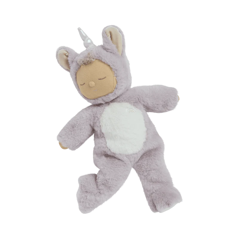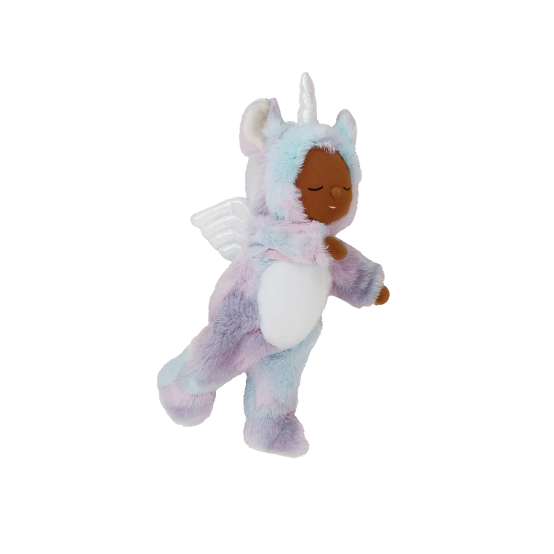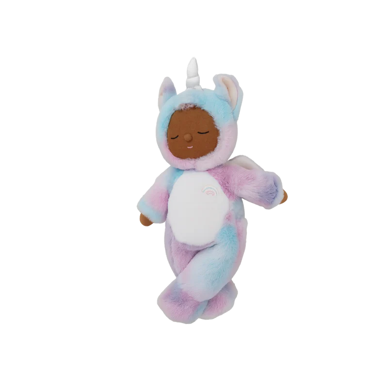Stardust has tripped out of the Rainbow Realm and wears a horn that sparkles mysteriously at just the right moment. With fluffy rainbow fur and glittering wings, Stardust is a friend full of magic—ready for adventures by day and cozy dreams by night. Thanks to her gently weighted, cuddly body, Stardust fits perfectly in little arms and provides comfort with every hug.