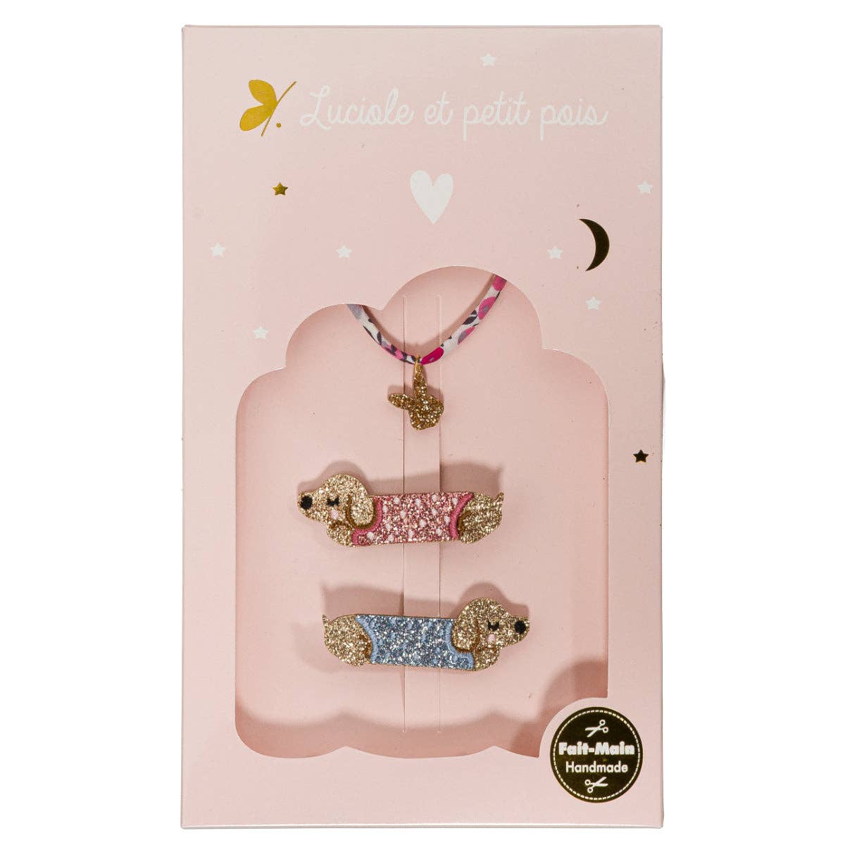 A magical set for anyone who loves glittery accessories and cute dogs! The lovingly designed box contains two sparkling dachshund hair clips and a Liberty bracelet in Wiltshire Bougainvillea , decorated with a pretty glitter bead. Ideal as a gift – or to treat yourself.