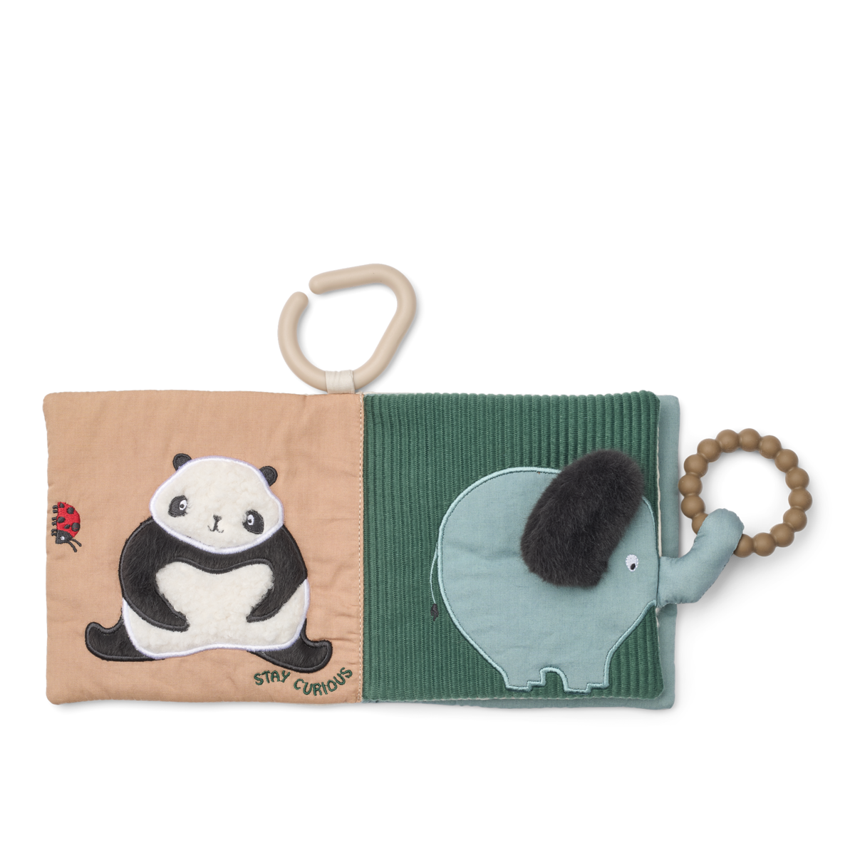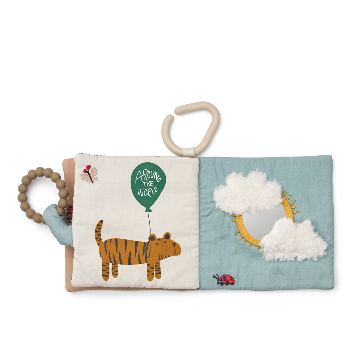 The Fey "Around the World" fabric activity book is a super-soft baby book with adorable animals – perfect for first discoveries from birth. Made from recycled polyester , it invites babies to grasp, marvel, and explore with its many tactile details. An integrated silicone teething ring , a small mirror , and crinkly fabrics playfully stimulate the senses and make every page a little adventure – ideal for on the go or for keeping babies entertained at home.