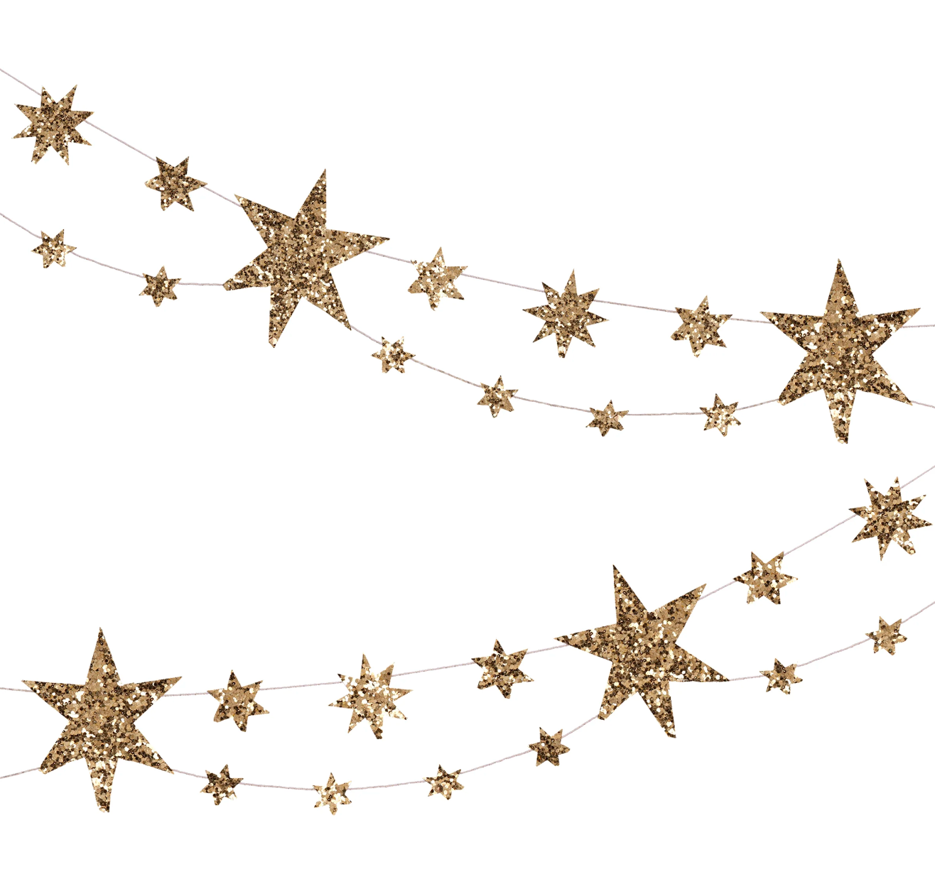 Whether it's a birthday, a holiday, or simply a touch of magic in everyday life, the sparkling star garland from Meri Meri transforms any room into a festive highlight. Featuring glittering platinum gold paper stars and a sophisticated cord, it's the perfect accessory to add stylish sparkle to any occasion.