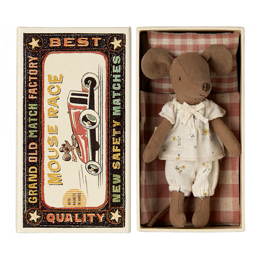 A classic Maileg item. This mouse is ready for hours of play and sleeps soundly in the matchbox. The clothes and bedding come with unique Maileg prints and beautiful colors.