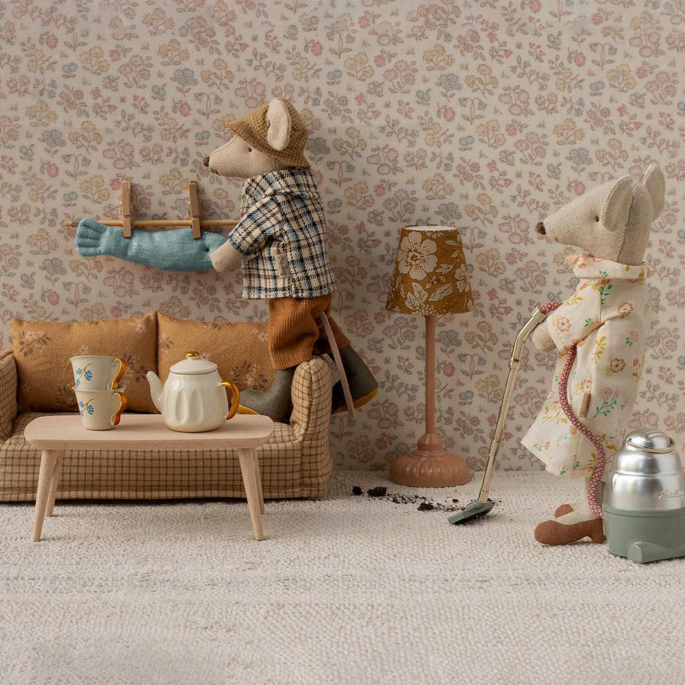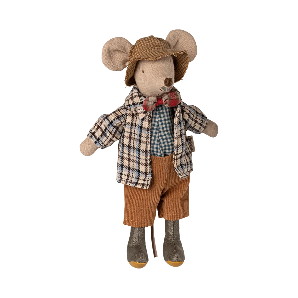 The grandfather looks both wise and kind – he wears rubber boots, a butterfly, trousers, and a jacket, and is always ready to cheer you up with his many stories. The mouse has magnets in its hands.