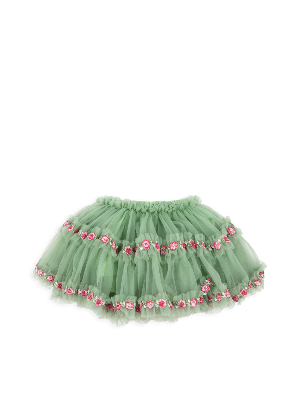 The Joelle Dress Green enchants with its dreamy volume and delicate flower details. The soft tulle creates a fairytale silhouette, while playful ruffles round off the romantic design. A single mother-of-pearl button on the back makes it child's play to put on. Perfect for special occasions or simply for little dreamers who like to dress up!