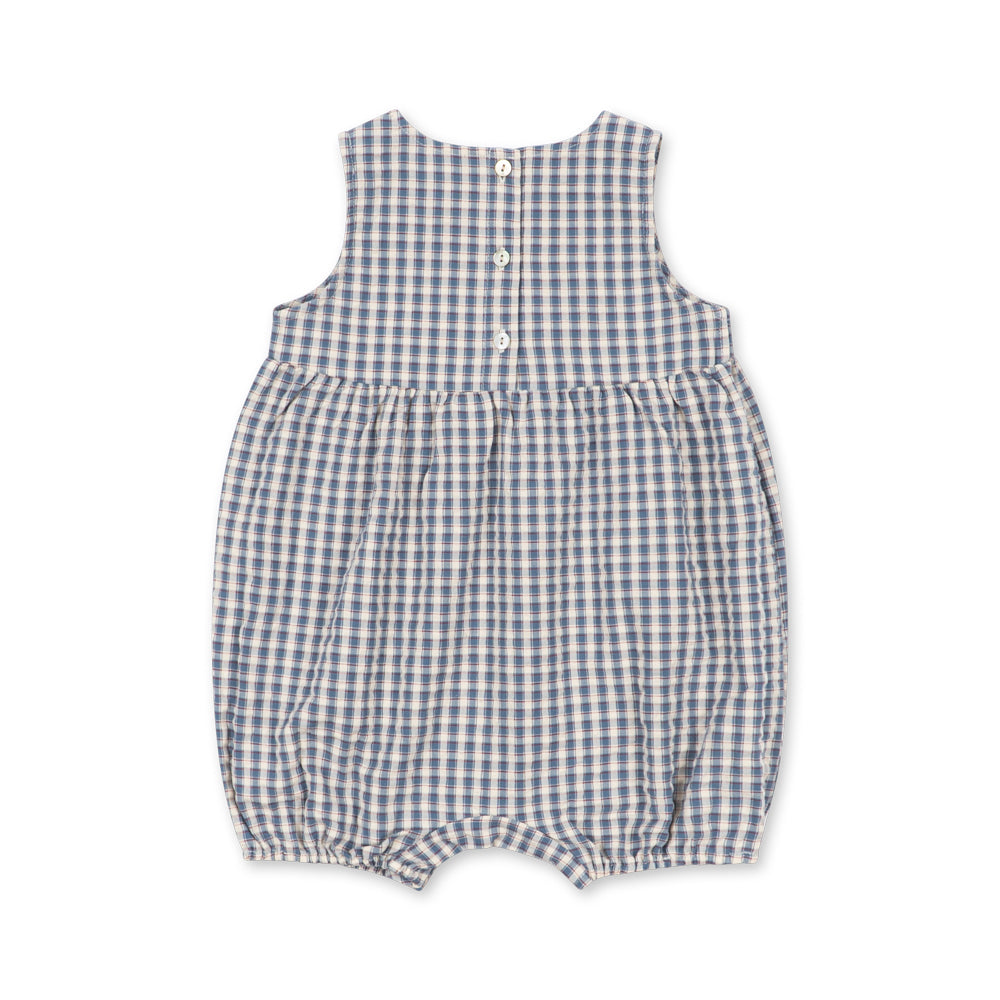 The Kim Captains Check romper combines classic design with airy comfort. Made from textured seersucker cotton, it's perfect for warm days. Elasticated cuffs and practical snap fasteners at the crotch make dressing and undressing easy, while the elegant mother-of-pearl buttons at the back add a charming touch.
