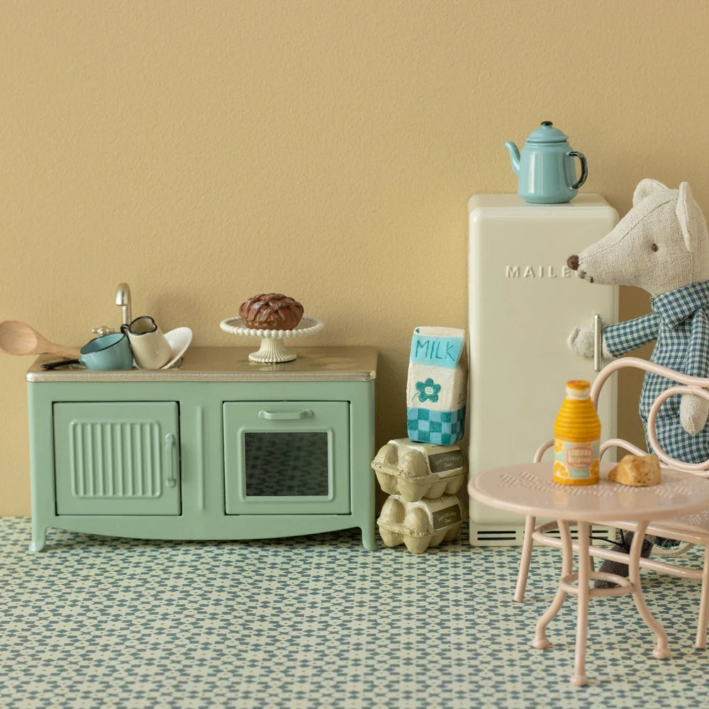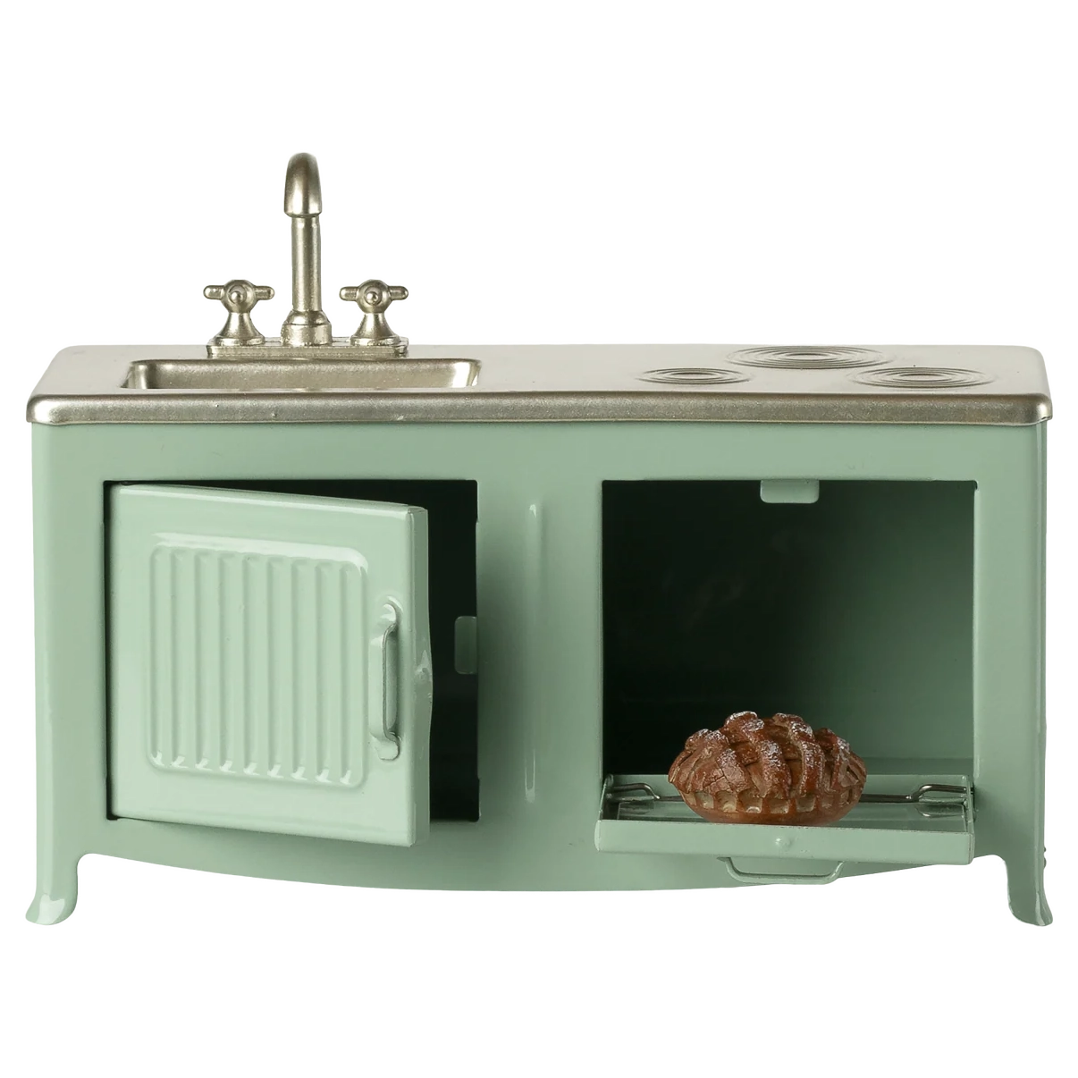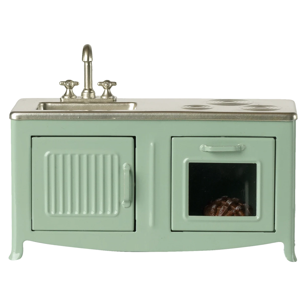 Das Herzstück eines jeden Hauses ist die Küche. Diese Metallküche hat einen schönen Farbton und viele verspielte Details wie Schranktürn, Spüle und einen Ofen mit einem frisch gebackenen Kuchen. Sie hat die perfekte Größe für die Mäusefamilie.$