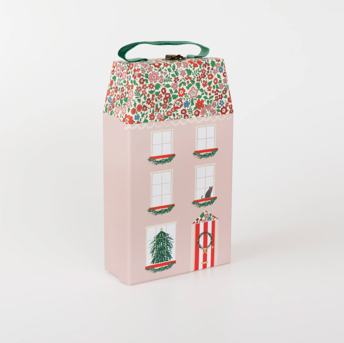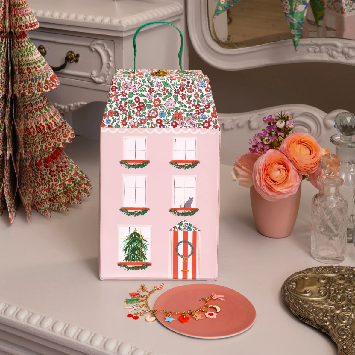 The exclusive charm bracelet Advent calendar from Meri Meri in collaboration with Liberty London transforms the Advent season into a festive jewelry experience. The enchanting suitcase-style house is finished with the iconic Liberty floral print, a luxurious green velvet bow, and a polished brass clasp—a true gem for your table, shelf, or mantel.