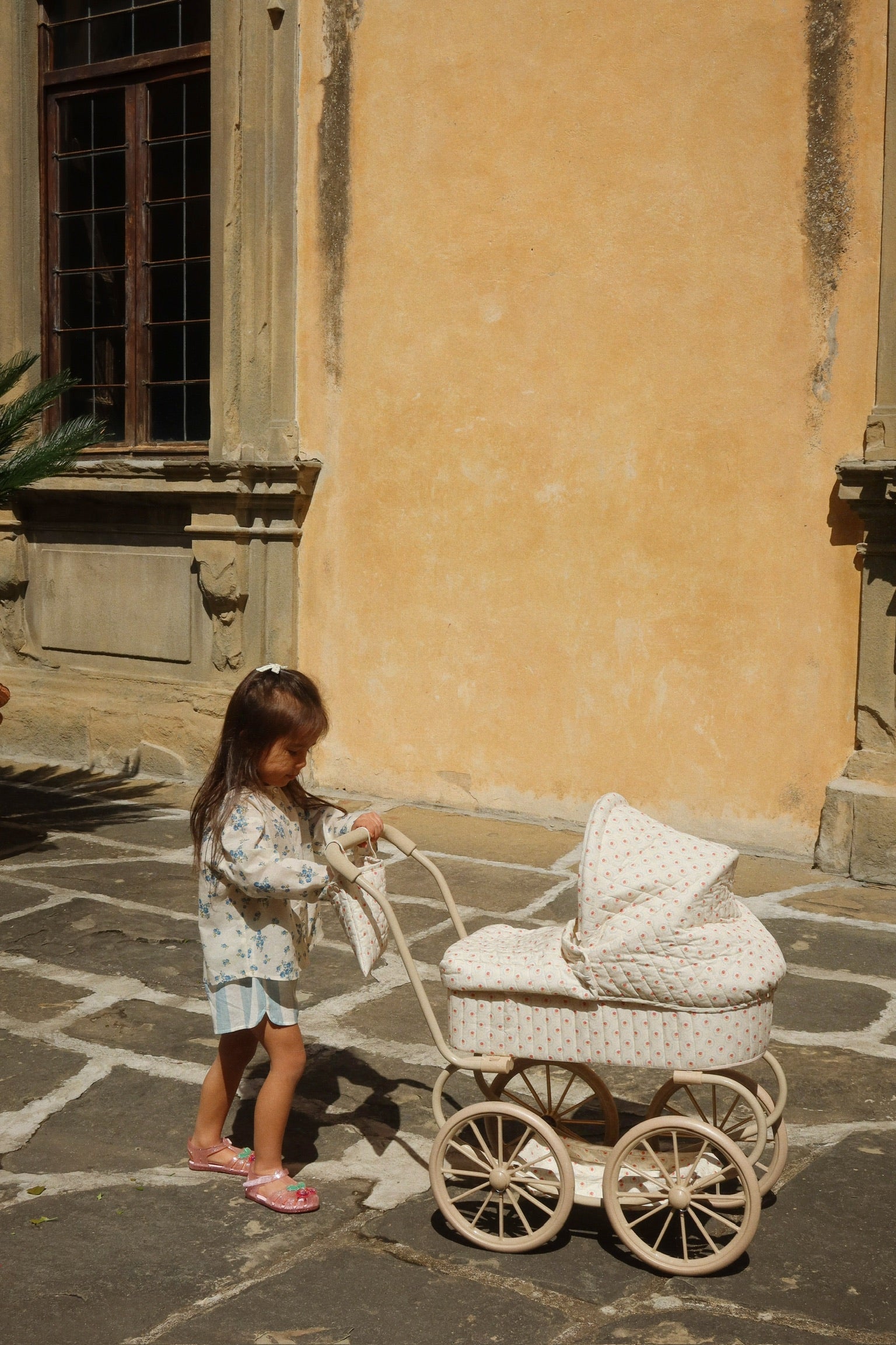 Discover the enchanting vintage-style doll's pram, now also available in a compact version for children aged 1 to 3 years. This charming doll's pram is equipped with four large wheels that ensure an effortless and stable ride. The lovingly quilted fabric and delicate scalloped edges give the pram an elegant touch.