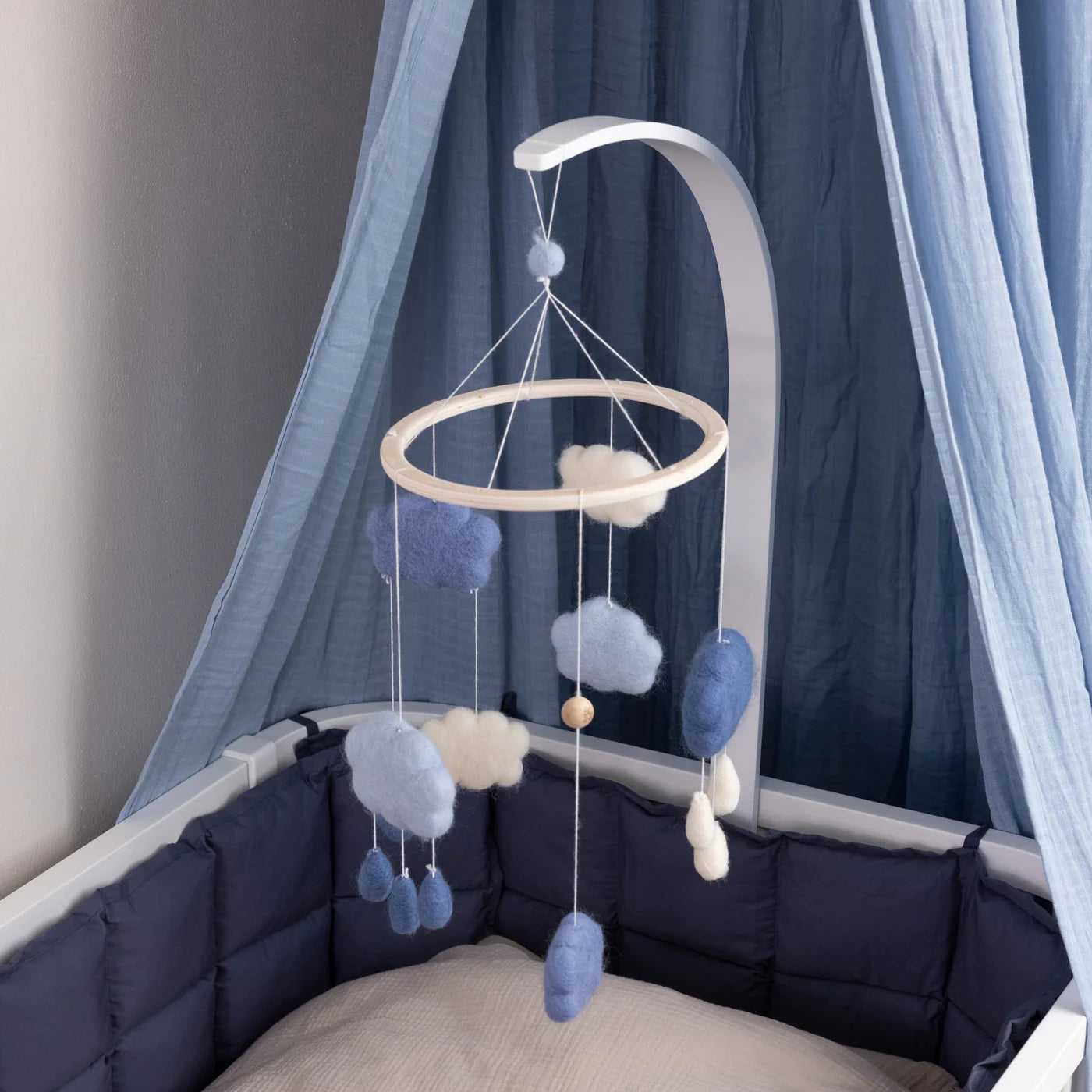 With Sebra's functional mobile holder, mobiles can be stylishly and safely placed above the crib or changing table. The lacquered wooden holder easily attaches between the bars of the Sebra Baby & Jr. bed or other furniture with mesh sides.