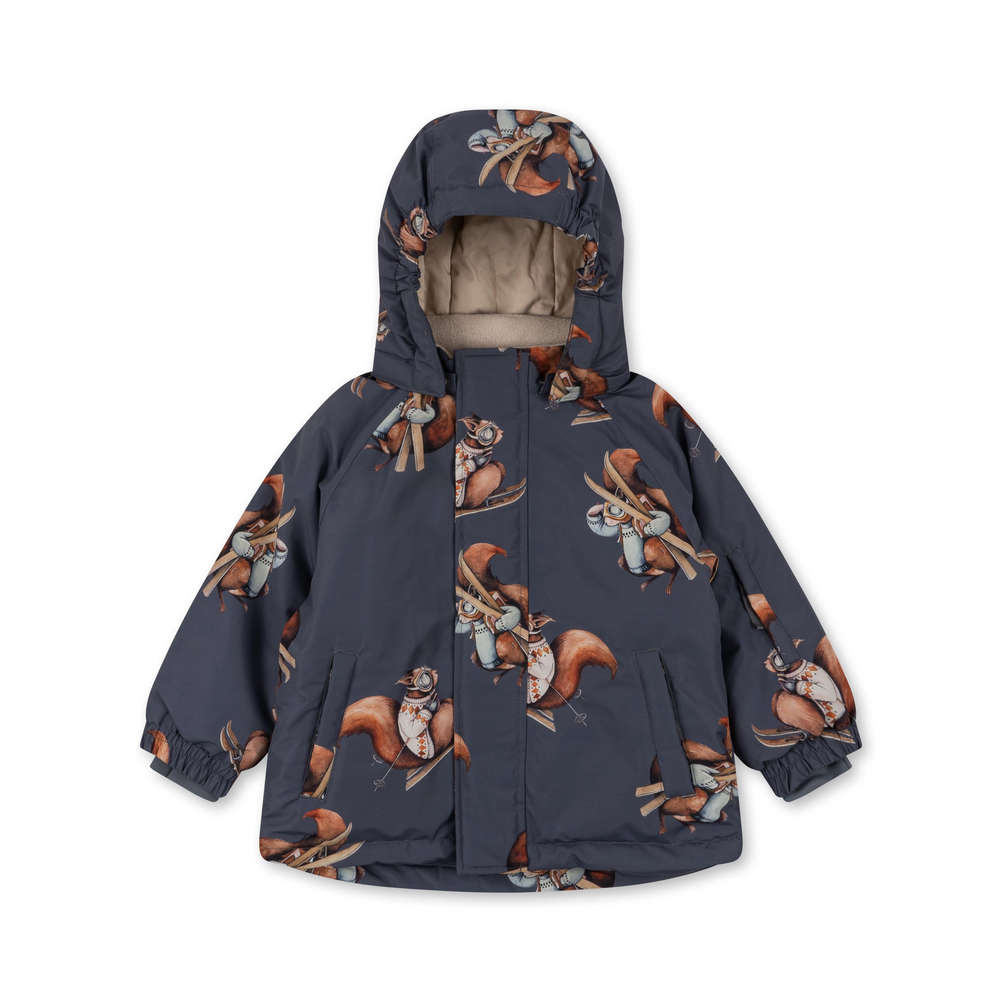 A highly breathable, waterproof, and windproof snowsuit made of 100 percent polyester. The hood is removable and fastens with buttons. Elastic cuffs and rubber foot loops ensure the snowsuit stays securely in place around the hands and feet. Suspenders on the inside make it easier for the child to remove the top part of the snowsuit if they get too warm or when going indoors.