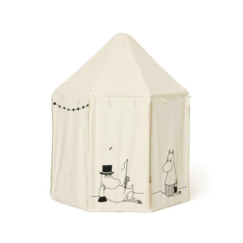 The Moomin Pavilion Tent invites little adventurers to play, cuddle, and dream. Inspired by Moominmamma's apron, the tent features practical pockets inside and out—perfect for books, toys, or small treasures. Crafted from sturdy certified cotton canvas and featuring FSC-certified wooden poles, it stands stable and secure. The door can be held open with ties, and the three included Moomin soft toys—Moominmamma, Little My, and Sniff—provide imaginative play.