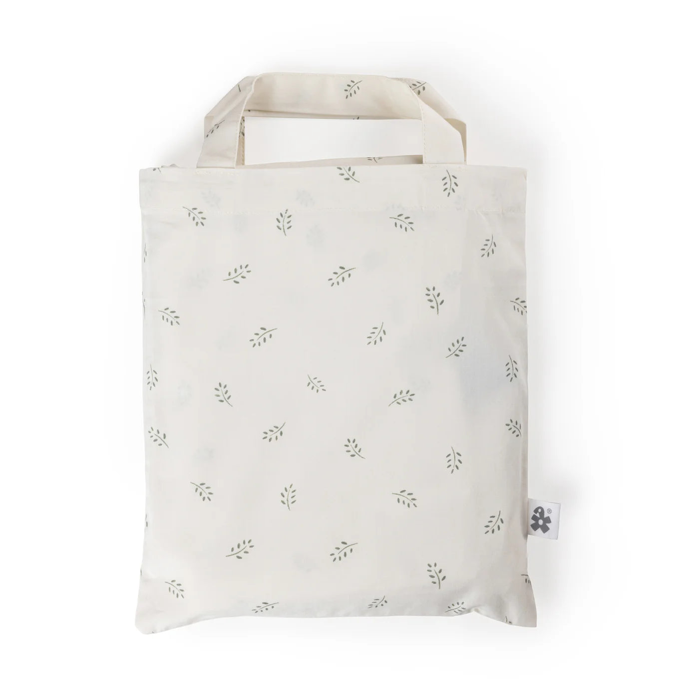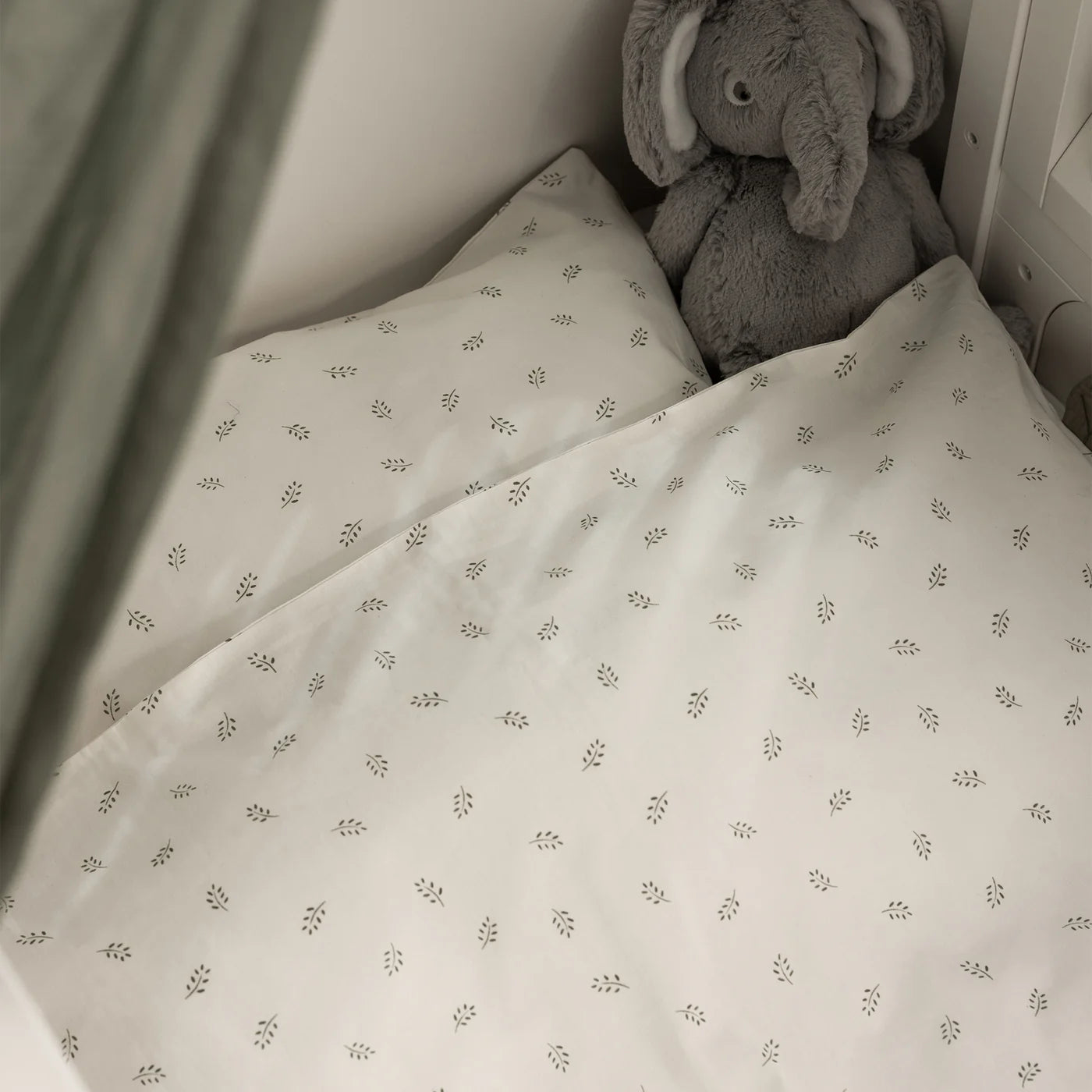This high-quality bed linen made from fine organic cotton percale impresses with its dense weave, its matte, soft surface, and the lovingly designed Sebra "Sophora Leaves" design. A small sewn-on leaf label on the duvet cover serves as a mini comforter for grasping and soothing—a thoughtful detail for tired baby hands.