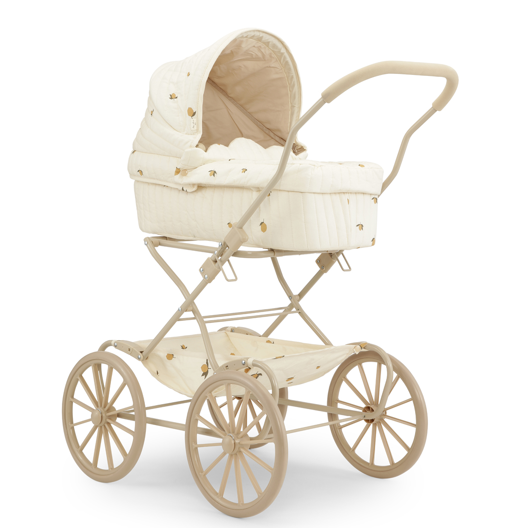 Konges Slojd's long-awaited large doll's pram has arrived! A gorgeous, vintage-style doll's pram with four large wheels made from EVA material for extra stability. Featuring quilted printed fabric and a 100% organic cotton mattress. It was designed with a softly padded storage basket under the infant carrier. The frame is metal with soft grips.