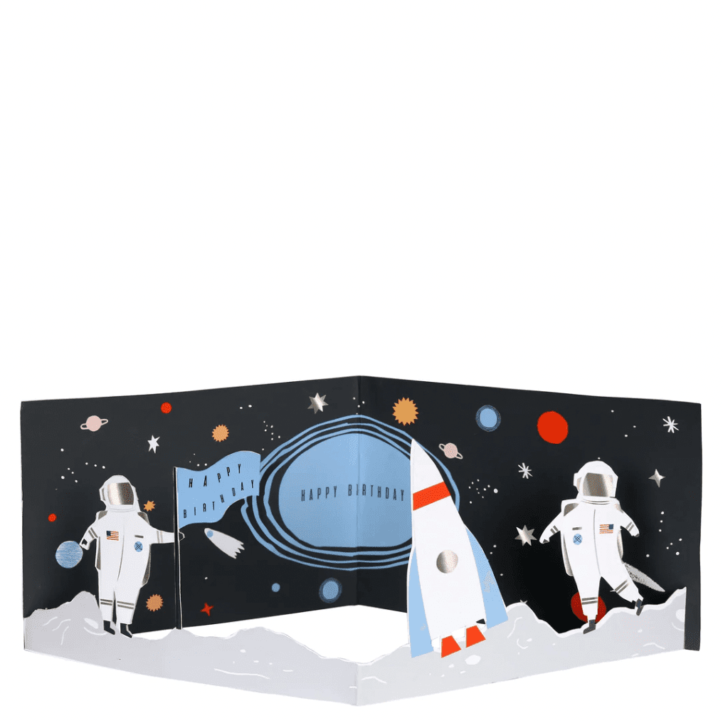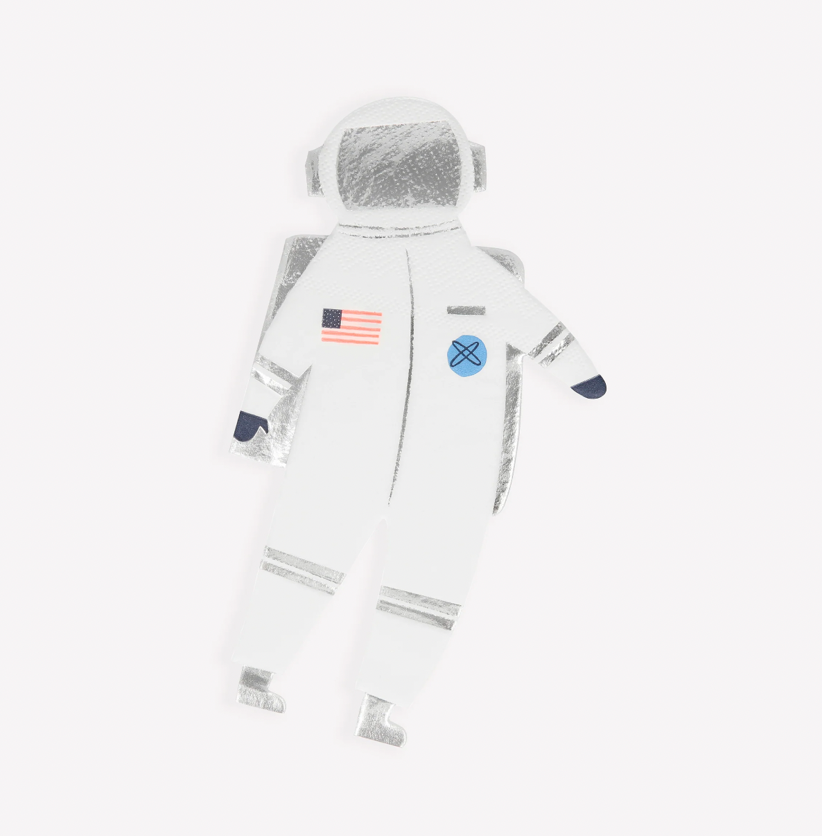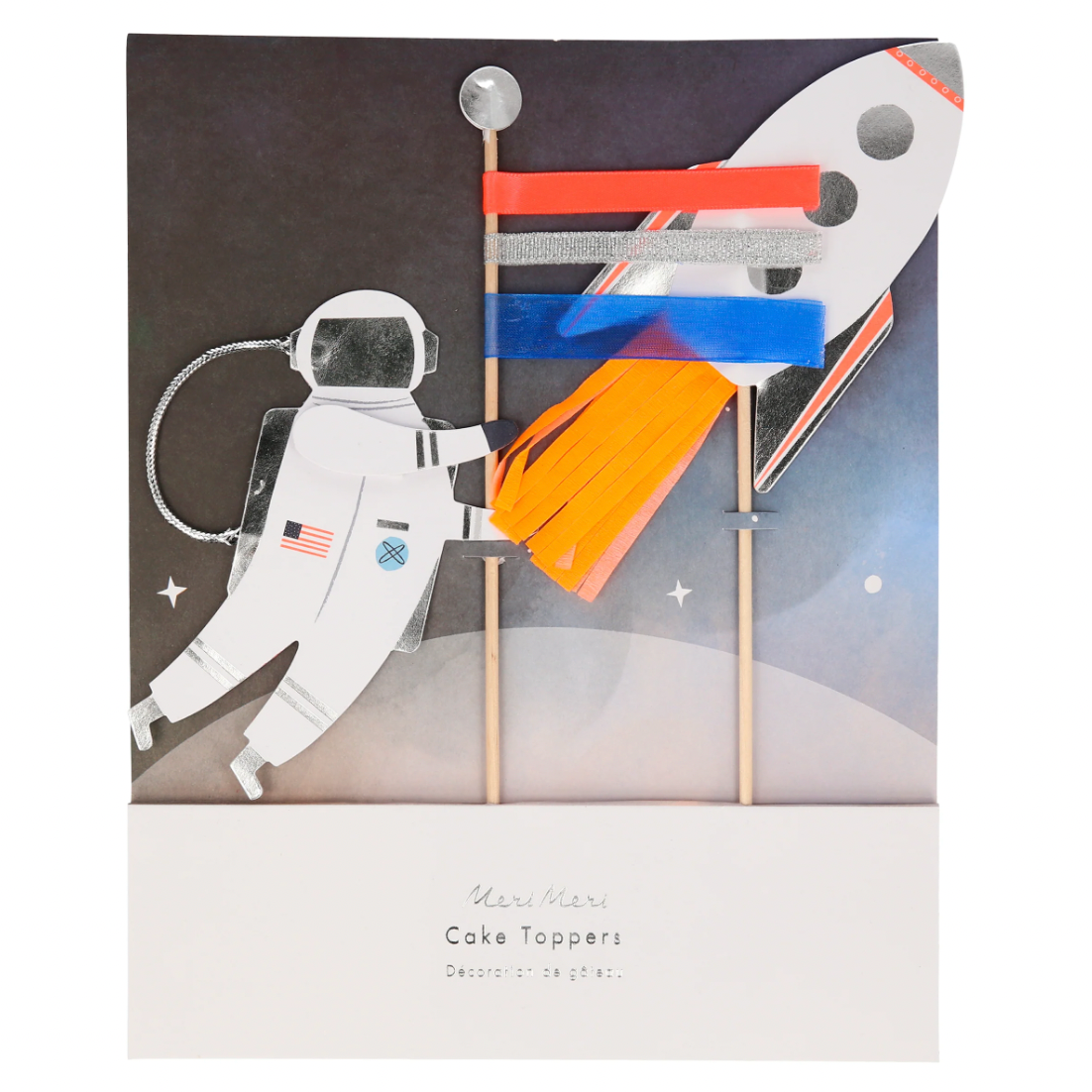Make your space-themed cake a real eye-catcher with this spectacular cake topper set! A brave astronaut with a colorful flag and a rocket heading into space ensure galactic party fun.