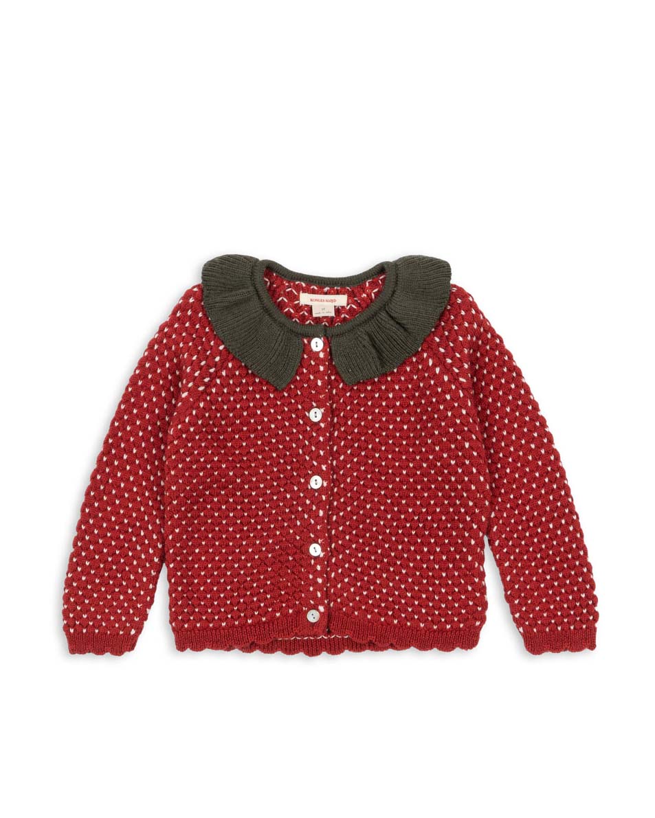 The Strawberry Cardigan in Barbados Cherry combines warmth, style, and supreme comfort. Crafted from 100% merino wool, it's exceptionally soft, breathable, and temperature-regulating. The textured knit pattern, round collar, and wave-shaped ribbed hems give the cardigan its playful, timeless look. It fastens at the front with delicate mother-of-pearl buttons—a favorite for every season.