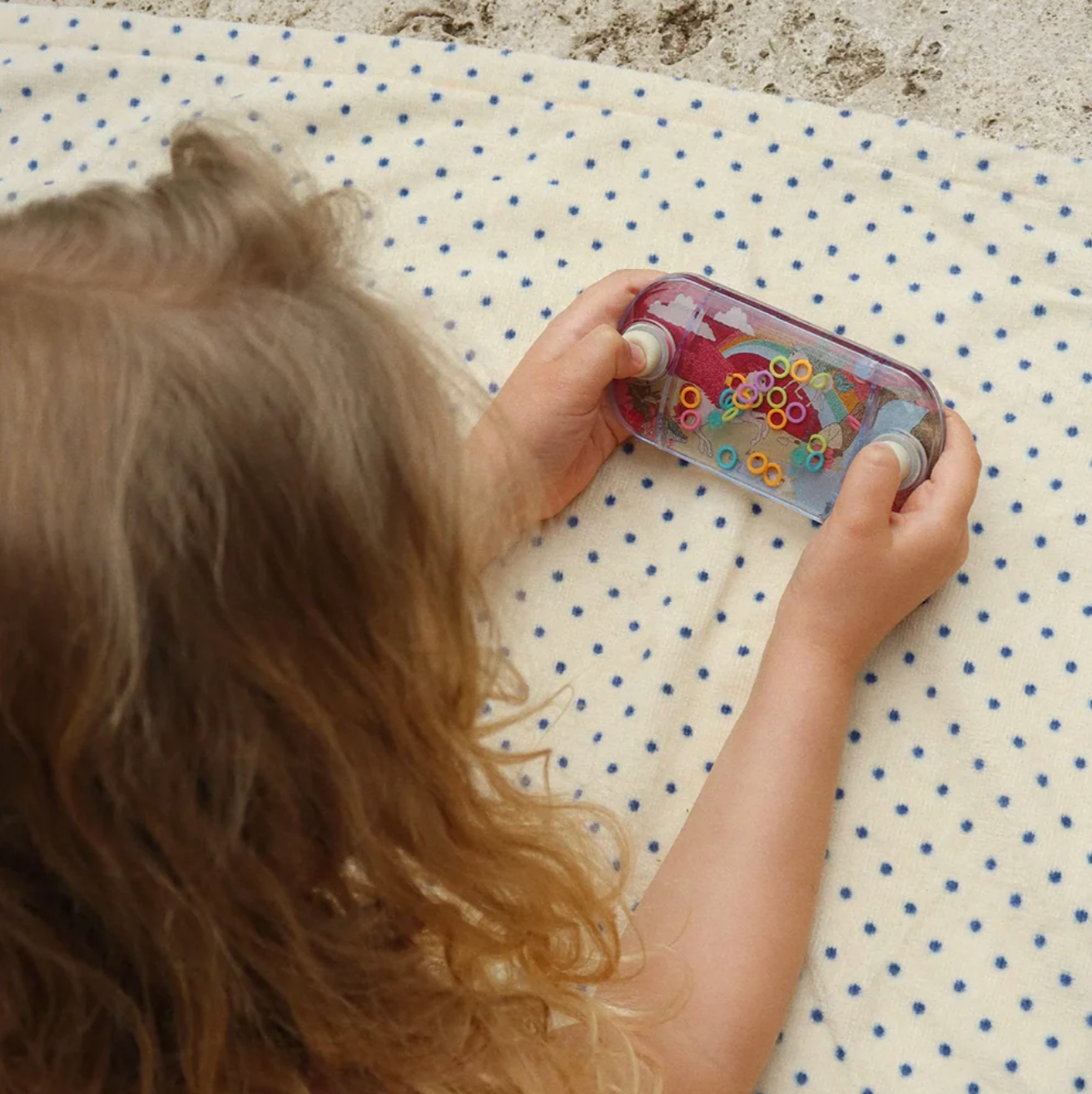 The Water Game, with its signature Konges Sløjd backgrounds, is a timeless classic for little hands: Children use the side buttons to set the water in motion and try to skillfully maneuver the colorful rings onto the floating sticks. Perfect for quiet moments at home or as a travel activity – it playfully promotes fine motor skills, concentration, and patience.