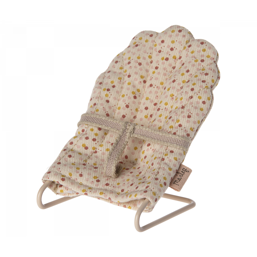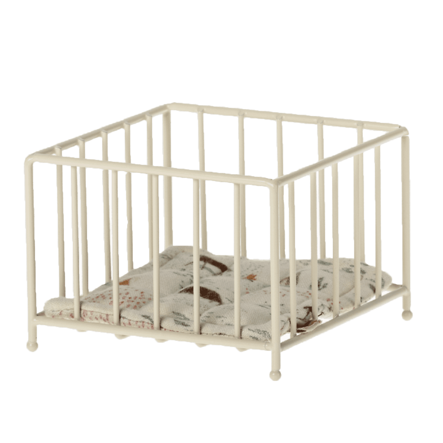 A beautifully designed metal cradle with a soft sleeping bag and mattress inside. The cradle has a small floral embossed headboard and rounded legs so you can rock the little ones to sleep.